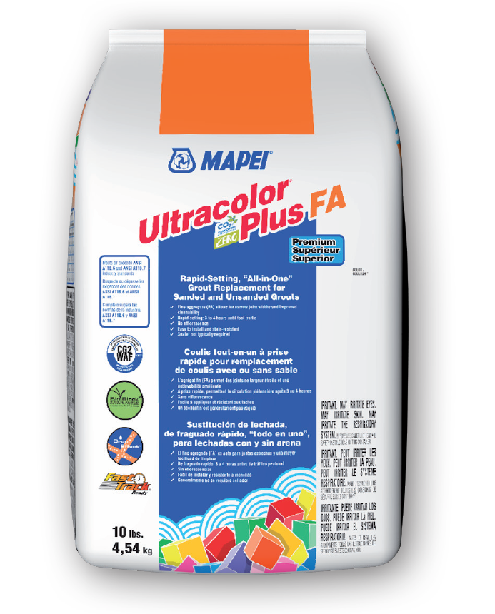 Ultracolor Plus FA – with DropEffect technology and zero impact on climate change – is an ultra-premium, fine-aggregate, fast-setting, polymer-modified, color-consistent, nonshrinking, efflorescence-free grout for joint widths from 1/16” to 3/4” (1.5 to 19mm). DropEffect reduces surface absorption to help repel water, dirt and grime from enetrating grout joints. Ultracolor Plus FA is specially formulated with MAPEI’s High-Hydrated Cement Technology (HCT) to eliminate common problems such as color consistency and efflorescence. Along with offering higher polymer content, HCT reduces absorption and increases stain resistance when compared with standard-performance cement grouts.