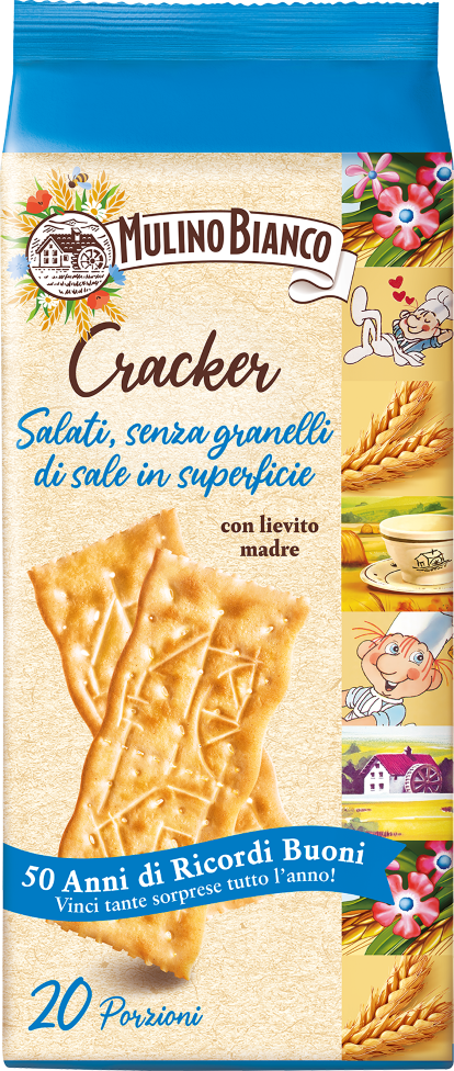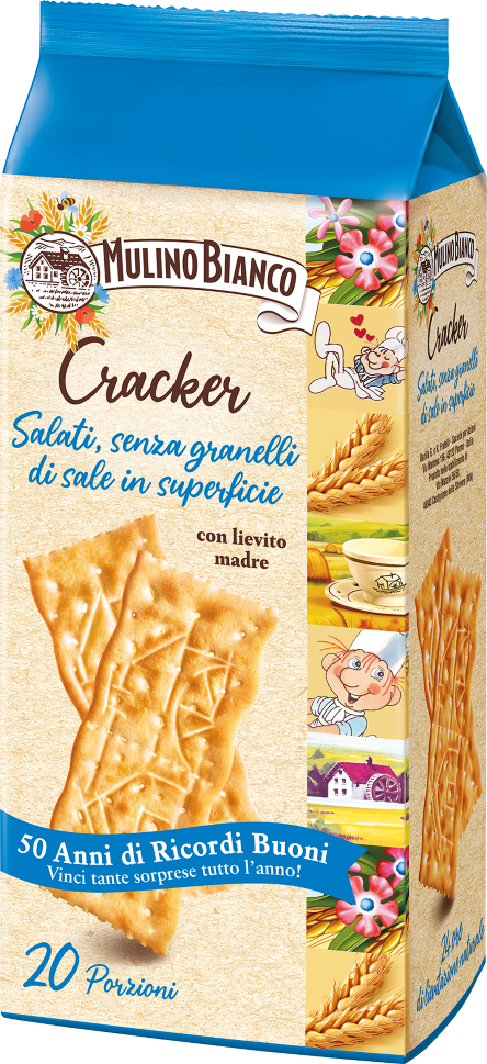The Mulino Bianco salty crackers, without grains of salt on the surface, are made in the Italian bakery products plant in Castiglione delle Stiviere (MN). They are sold in packs of 500 grams and are ready for consumption.