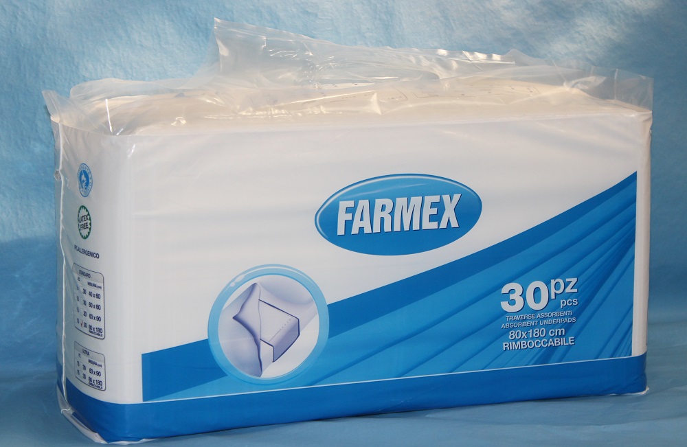 Absorbent crosspieces are suitable for every case of incontinence, both urinary and fecal, for bedridden patients. It is not wearable, but can be placed between patient, support, and it guarantees personal hygiene. Its external part is made of soft polyethylene, non-toxic and waterproof which acts as an insulating barrier. The absorbing area is made of pure cellulose, uniformly distributed and firmly joined to the cover so that it is all compact. Inner surface is fully covered by a layer of hypoallergenic non-woven fabric. Its structure determines an efficient liquid retention.