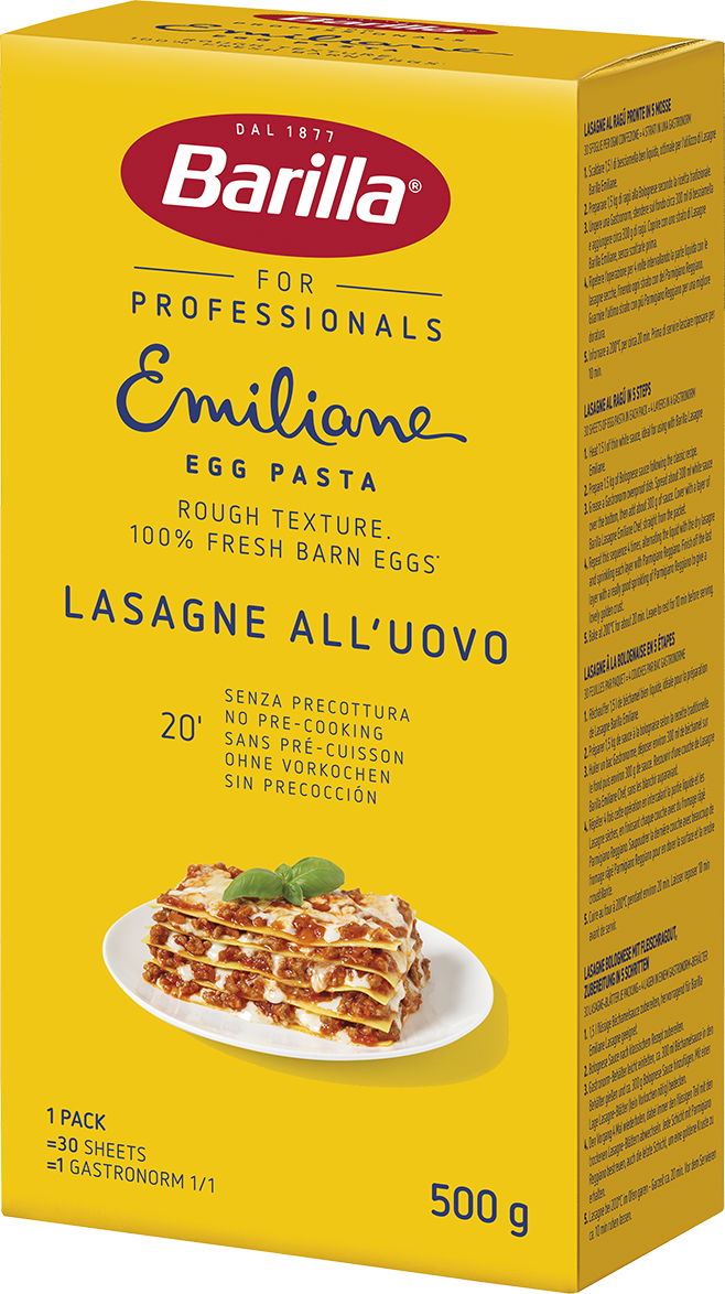 Emiliane Chef Egg Lasagne produced in Italy for export market is a product developed by Barilla for the Food Service. Egg pasta is produced in the Italian Pedrignano pasta plant in Parma, using as only ingredients durum wheat semolina and eggs, and they are packed in 500 grams formats.