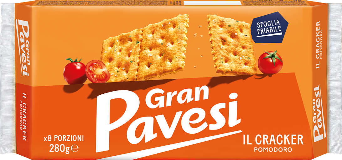 Gran Pavesi Tomato crackers are Italian typical crispbreads, flavoured with dry tomato. Gran Pavesi are realized in the Italian bakery plant of Novara. They are packed in 280 grams format and are ready for the consumption. For more information about the product see https://www.granpavesi.it/prodotti/crackers.