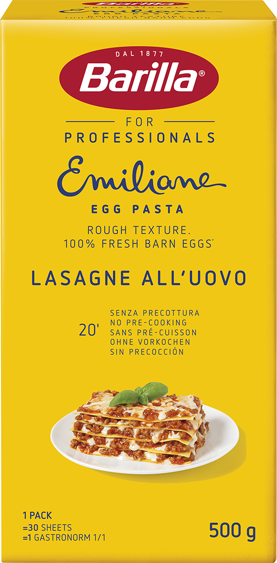 Emiliane Chef Egg Lasagne produced in Italy for italian market is a product developed by Barilla for the Food Service. Egg pasta is produced in the Italian Pedrignan pasta plant in Parma, using as only ingredients durum wheat semolina and fresh free-range eggs.