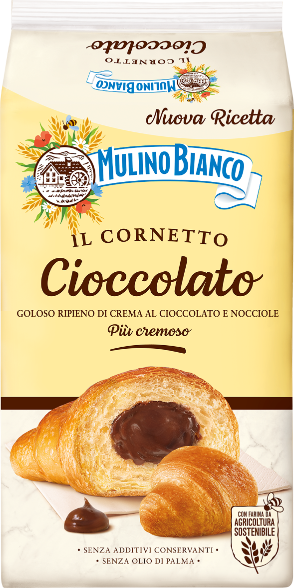 I cornetti Mulino Bianco con crema al cioccolato sono delle tipiche merende italiane di pasta sfoglia, sono prodotti nello stabilimento italiano di prodotti da forno di Cremona e venduti in confezioni da 300 grammi. Sono pronti per il consumo. Per maggiori informazioni relative al prodotto visitare il sito https://www.mulinobianco.it/prodotti/merendine-e-torte.
