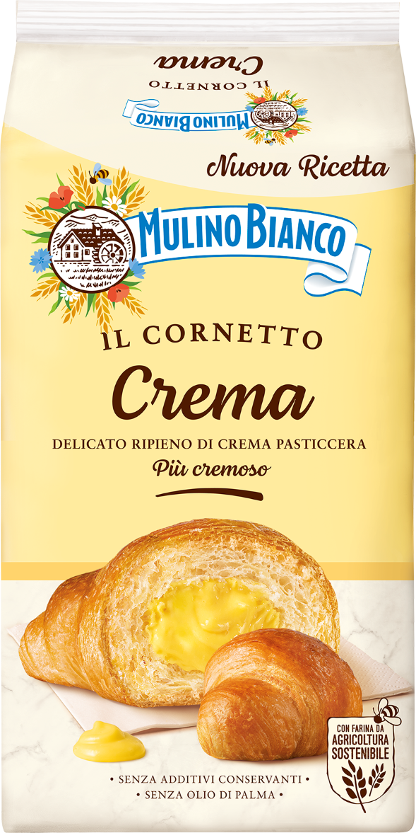 Mulino Bianco cornetti with custard are typical Italian brioches, produced in the Italian bakery plant of Cremona. They are packed in 300 grams formats and are ready for consumption. For more information about the product see https://www.mulinobianco.it/prodotti/merendine-e-torte.