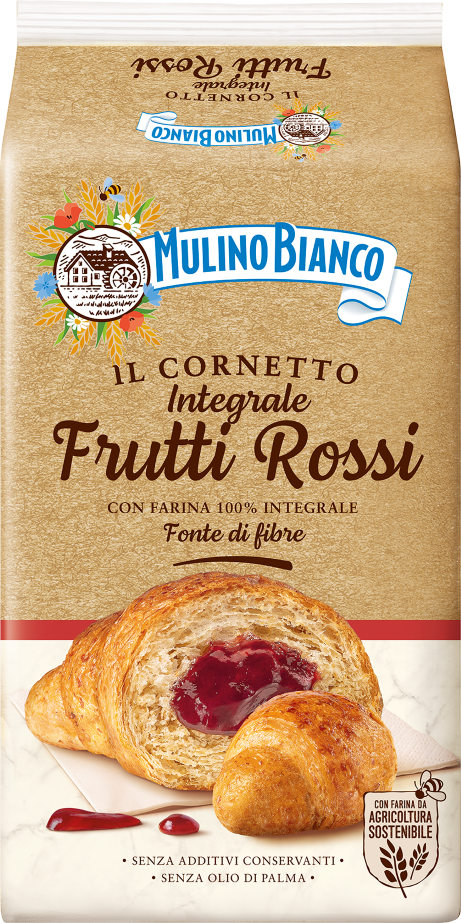 Mulino Bianco cornetti with whole wheat flour and red fruits jam are typical Italian brioches, produced in the Italian bakery plant of Cremona. They are packed in 300 grams formats and are ready for consumption. For more information about the product see https://www.mulinobianco.it/prodotti/merendine-e-torte.