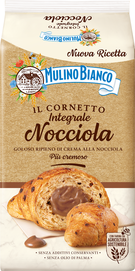 Mulino Bianco cornetti with whole wheat flour and hazelnut cream, are typical Italian brioches, produced in the Italian bakery plant of Cremona. They are packed in 300 grams formats and are ready for consumption. For more information about the product see https://www.mulinobianco.it/prodotti/merendine-e-torte.