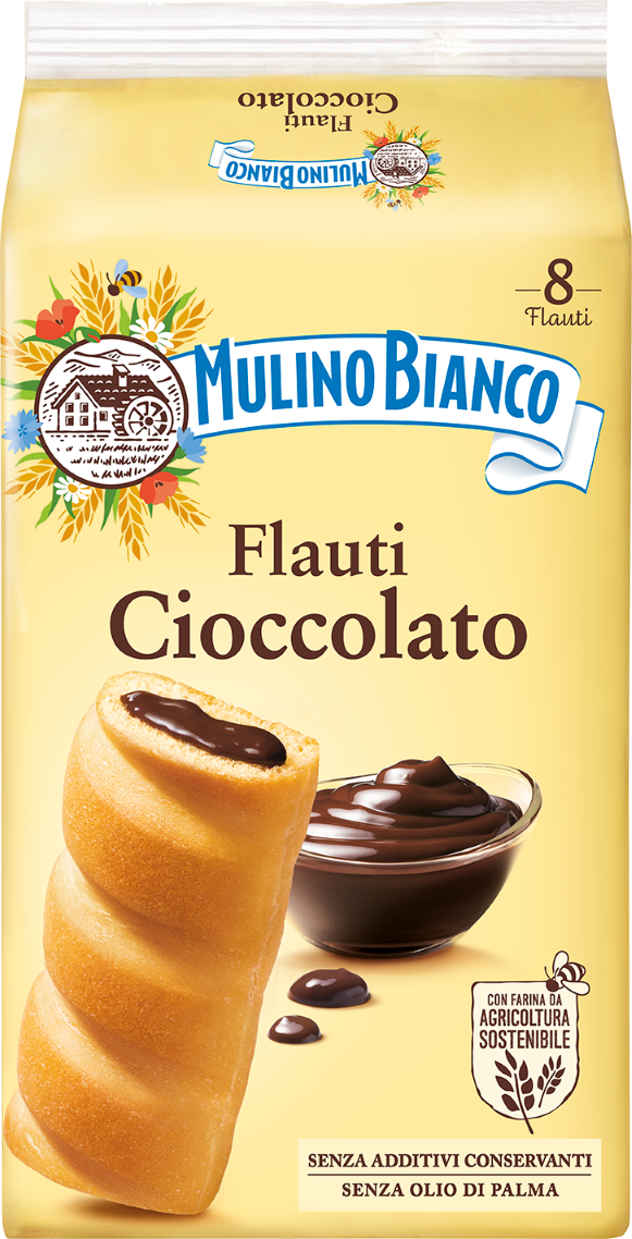 Flauti al Cioccolato are soft snacks, stuffed chocolate cream. Flauti are produced in the Italian bakery plant of Melfi (PZ), are sold in packaging of 280 grams format (designed for recycling) and they are ready for consumption. For more information, please visit https://www.mulinobianco.it/flauti-cioccolato.