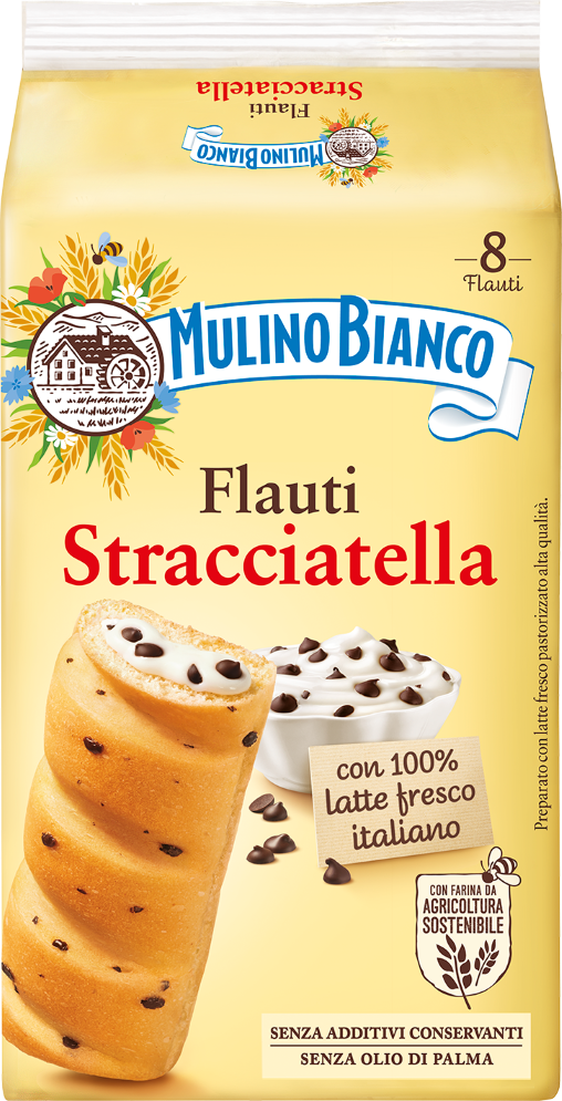 Flauti alla Stracciatella are soft snacks, stuffed with milk cream with chocolate chips. Flauti are produced in the Italian bakery plant of Melfi (PZ), are sold in packaging of 280 grams format (designed for recycling) and they are ready for consumption. For more information, please visit https://www.mulinobianco.it/flauti-stracciatella.