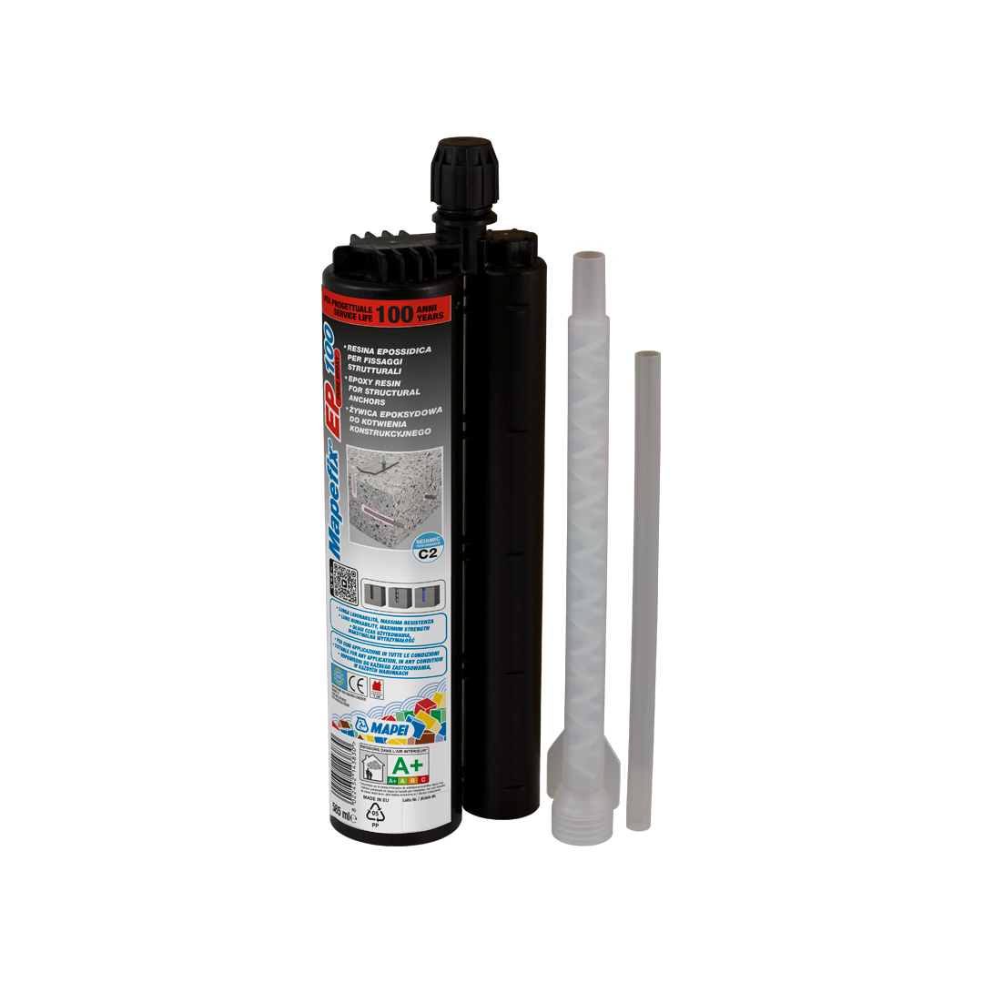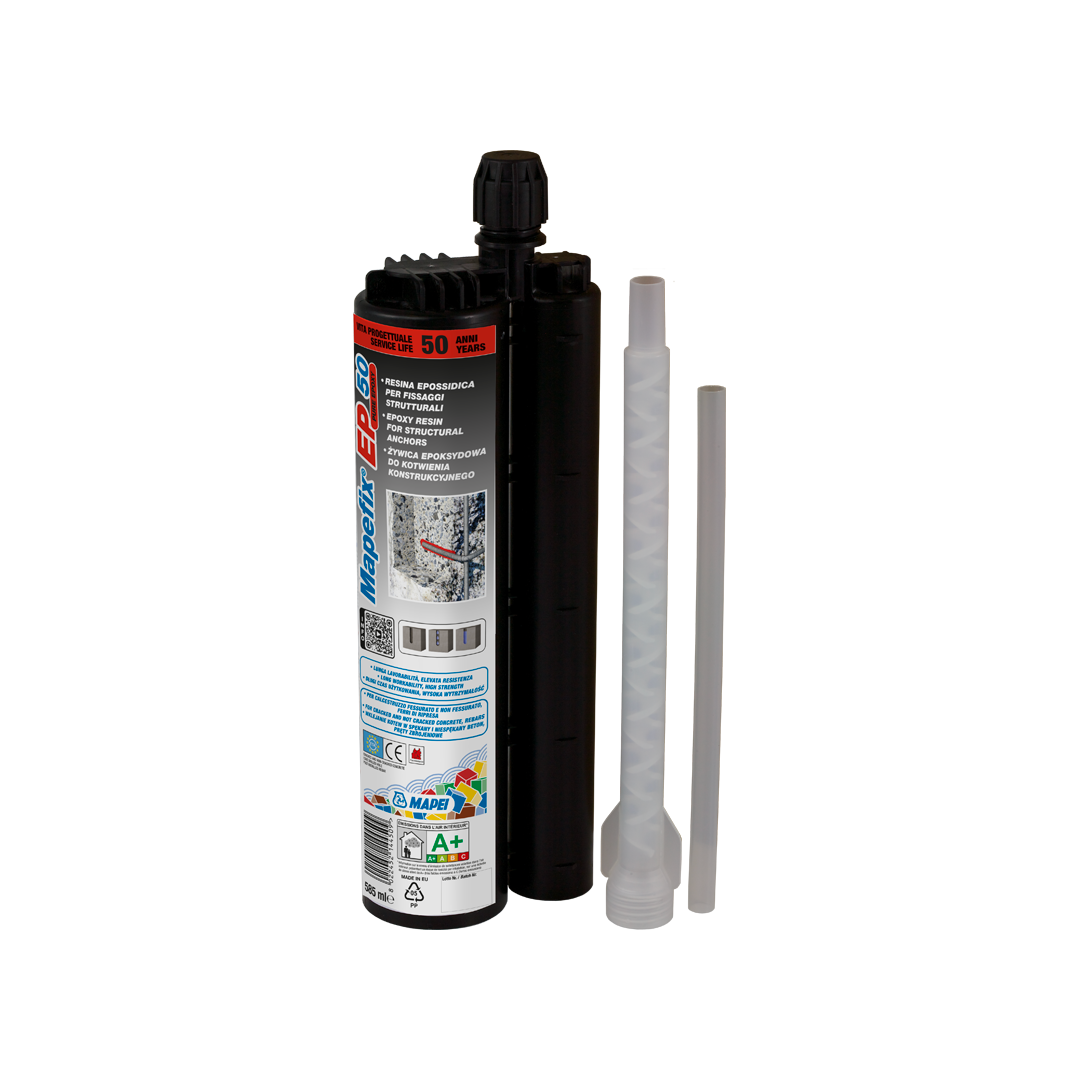 Mapefix EP 50 and Mapefix EP 100 are an adhesive for chemically anchoring metal bars in holes drilled in building materials. They are a two-component, pure epoxy resin-based product containing no solvents. They are available in 585 ml bi-axial cartridges. It is specifically formulated for anchoring threaded components and rebar made from steel and galvanized steel that transmit structural loads into solid substrates such as concrete, lightweight concrete, stone, wood and sound masonry.