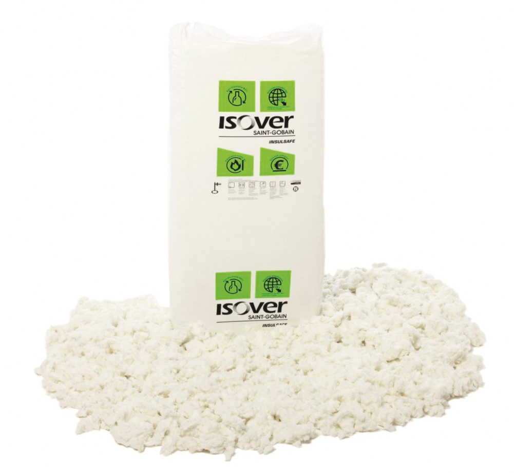 Isover InsulSafe is white colored glass wool in flakes, produced with recycled glass, without thermosetting resin. It is packed in bags and must be mechanically blown.