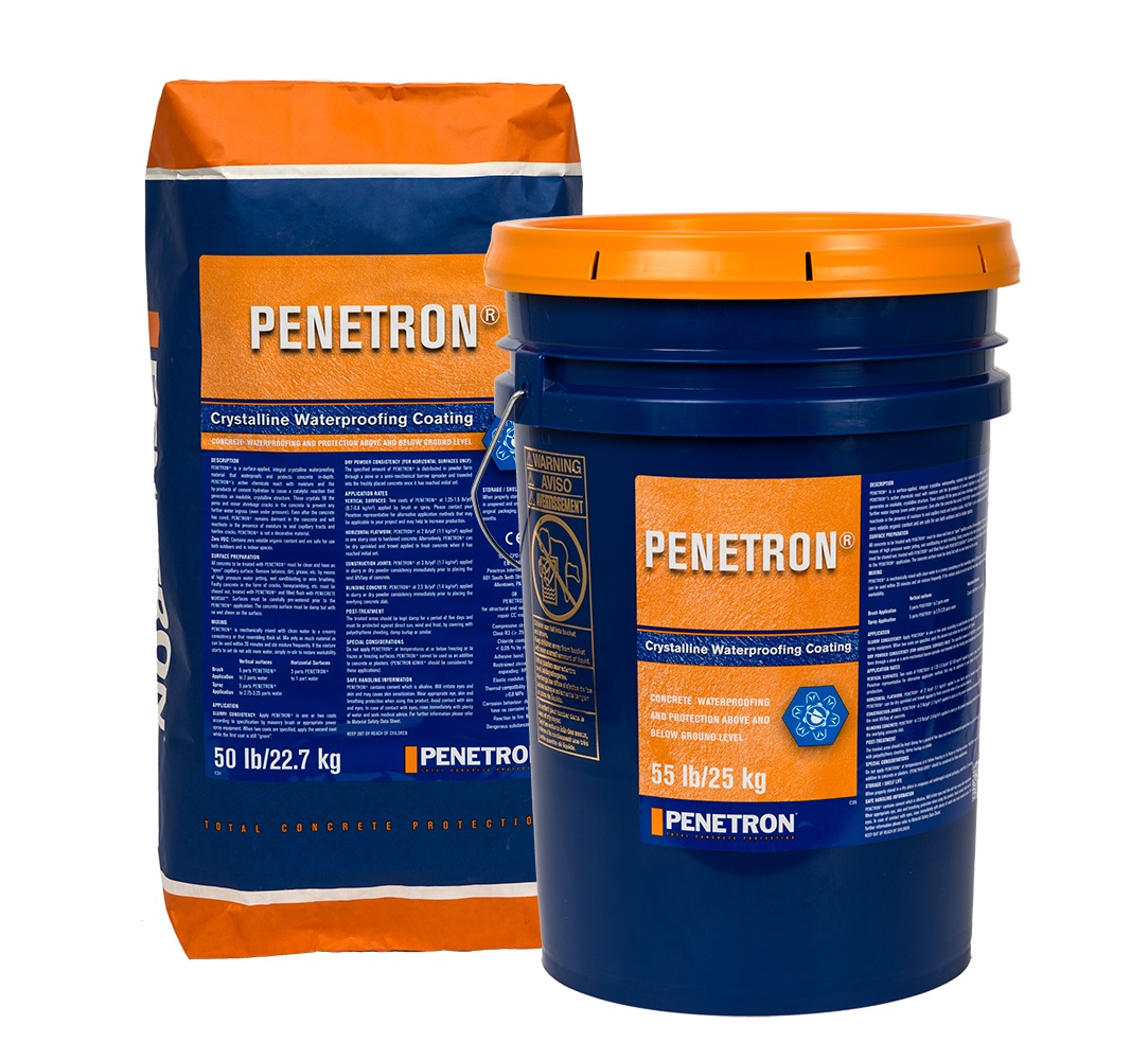 PENETRON® PENETRON® is a surface-applied, integral crystalline waterproofing material, which waterproofs and protects concrete in-depth. It consists of Portland cement, specially treated quartz sand and a compound of active chemicals. PENETRON® needs only to be mixed with water prior to application. When PENETRON® is applied to a concrete surface, the active chemicals react with moisture and the by-products of cement hydration to cause a catalytic reaction that generates an insoluble, crystalline structure. These crystals fill the pores and minor shrinkage cracks in the concrete to prevent any further water ingress (even under pressure).
