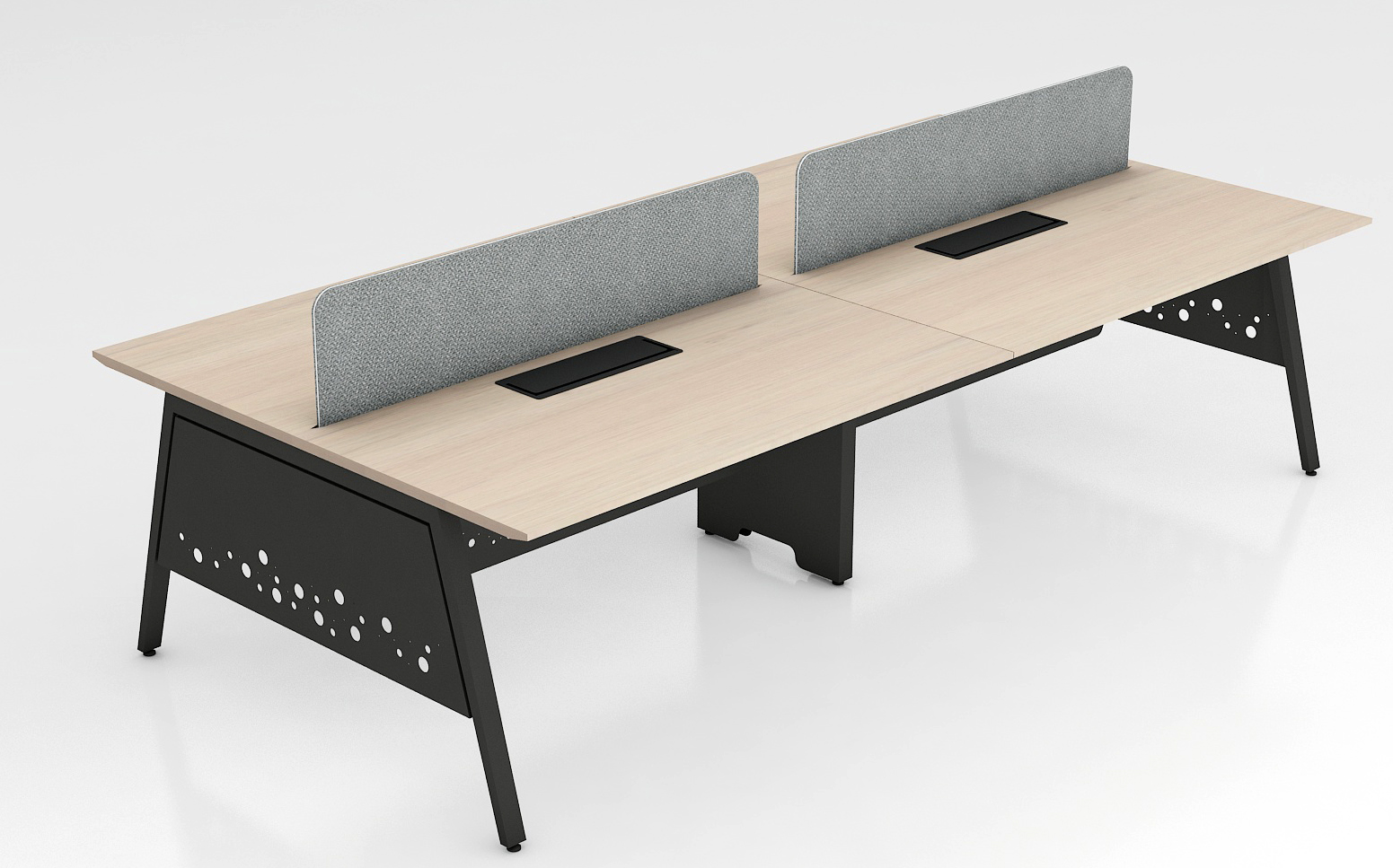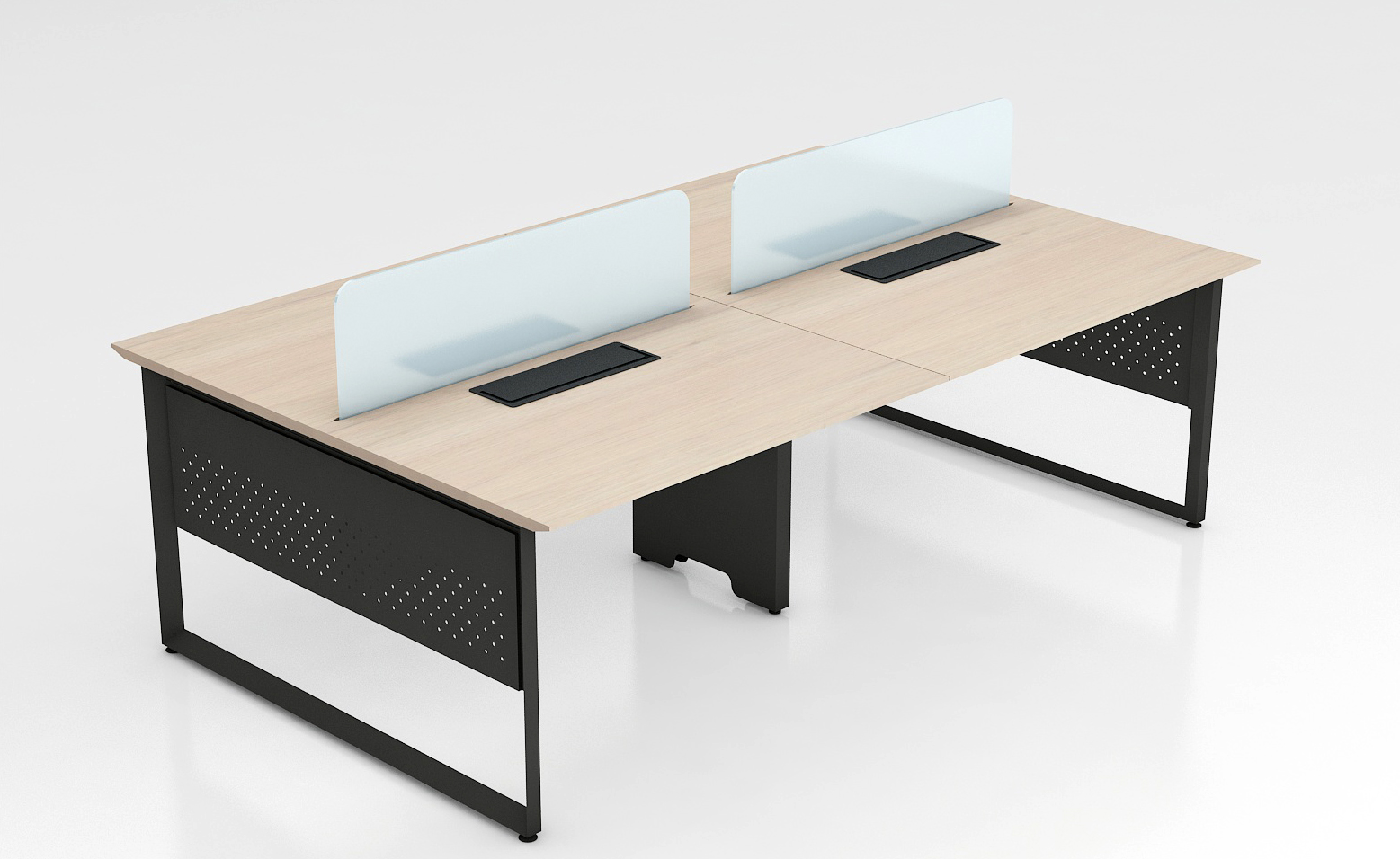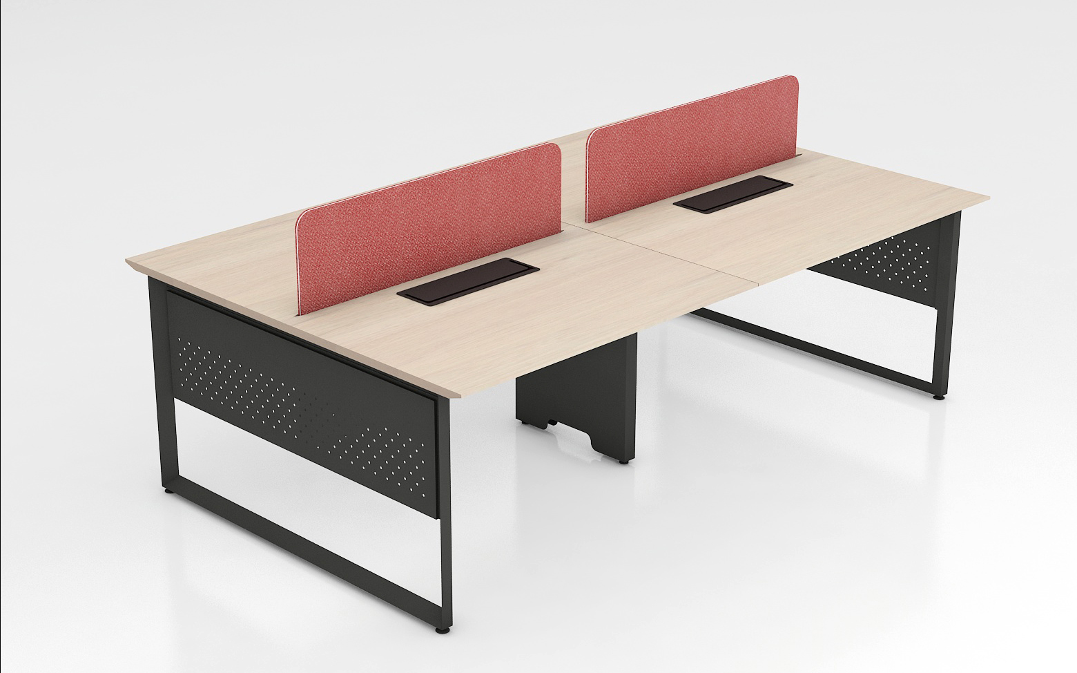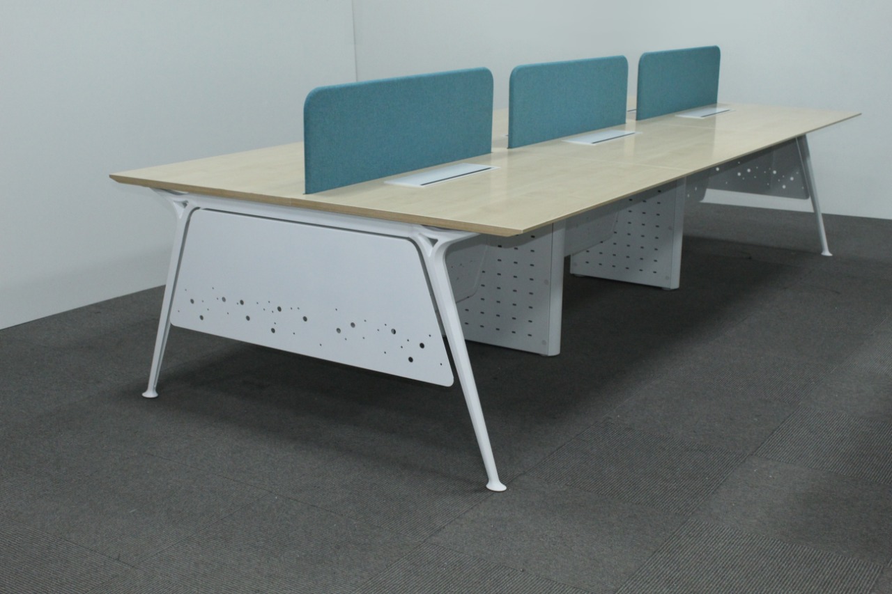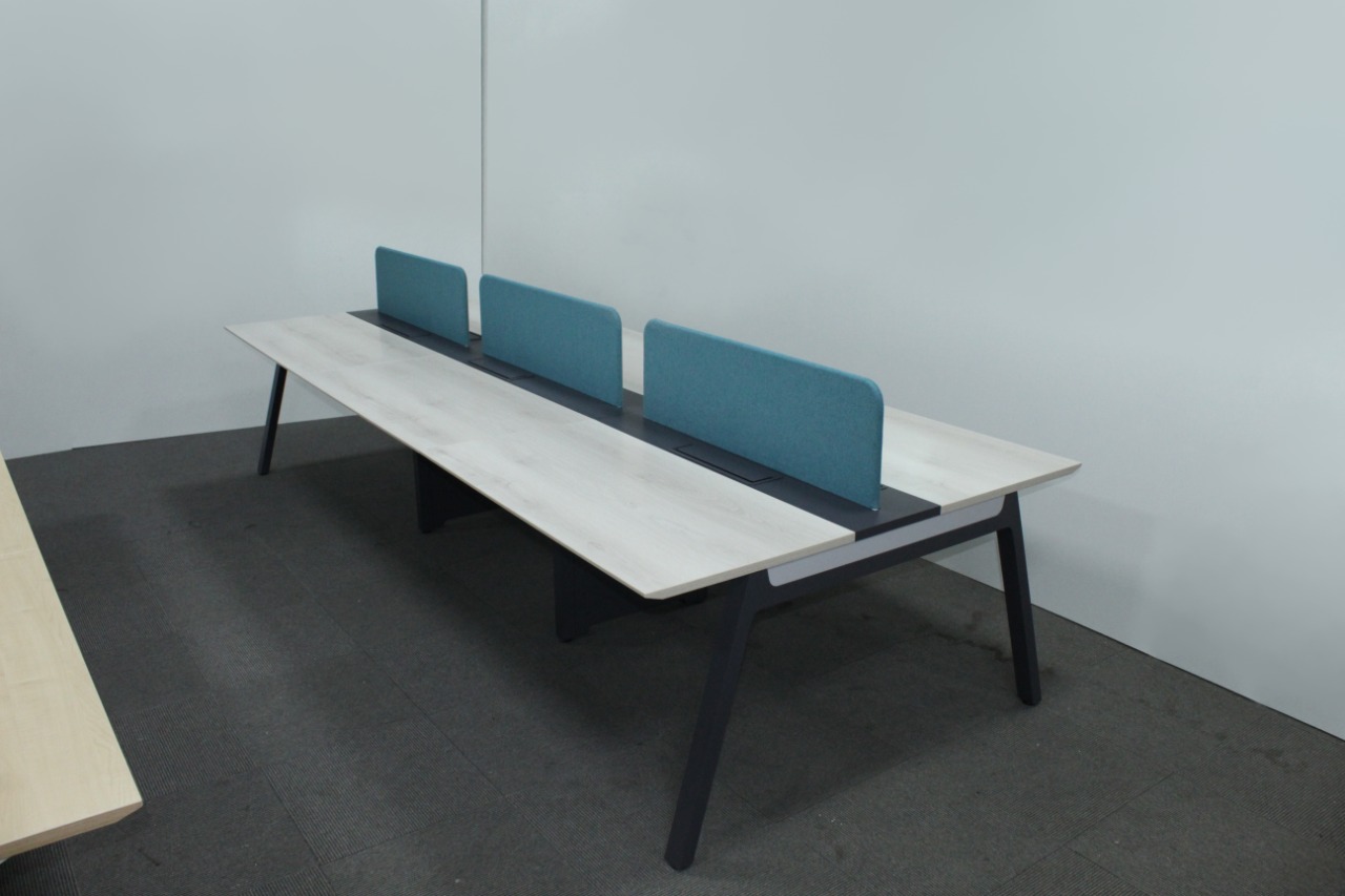 Option of table mounted. Flip Top box can also be provided for fixing electrical and data sockets on the table. Special wire runners are provided for concealed entry of wires from floor to the cable beam. Snap-fit openable cover section is provided on the wire runners for ease of maintenance. Desk panels 8mm thick laminated glass, 18/25mm thick soft/magnetic fabric panels, combination of grid marker and fabric panels. Type of legs: Laminated gable ends, designer legs, MS powder-coated legs. Accessories: Flip top, file tray, pencil tray, TP lock. Power and data provision MS raceway below table top socket access through wire manager or access flap. Table tops 25mm thick in PLPB/MDF.
