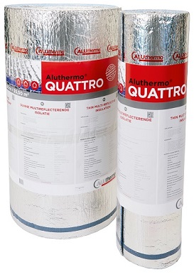 • a film of pure aluminium, 30 microns thick, treated against oxidation • a layer of bubbles of dry air enclosed in self-extinguishing polyethylene • a film of pure aluminium treated against oxidation • a foam of fire-retarding and waterproofed polyethylene • a film of pure aluminium treated against oxidation • a layer of bubbles of dry air enclosed in self-extinguishing polyethylene • a film of pure aluminium, 30 microns thick, treated against oxidation The air trapped in the bubble film and polyethylene foam is dry and stable. Aluthermo QUATTRO® provides very efficient thermal insulation in combination with limited thickness. Its exceptional properties of flexibility make placement very easy.