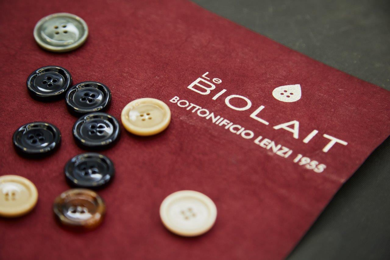 Le.Biolait® buttons are made of Le.Biolait® bioplastic, a special galalith-like material which does not involve the use of formaldehyde in its production. Bottonificio Lenzi owns intellectual property on Le.Biolait®. Button rounds are cut and drilled to obtain the desired form and thickness. Buttons are then finished by tumbling and drying.