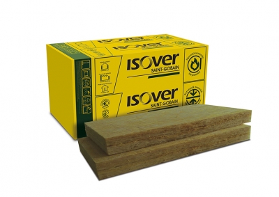 Boards made from ISOVER stone wool. The boards are obtained by melting the mineral raw materials in a furnace, fiberizing the melt by REX process, spraying a binder and adding mineral oils for protection against dust and water repellence. The mineral fibers mat is processed into boards that are packaged on the production line.