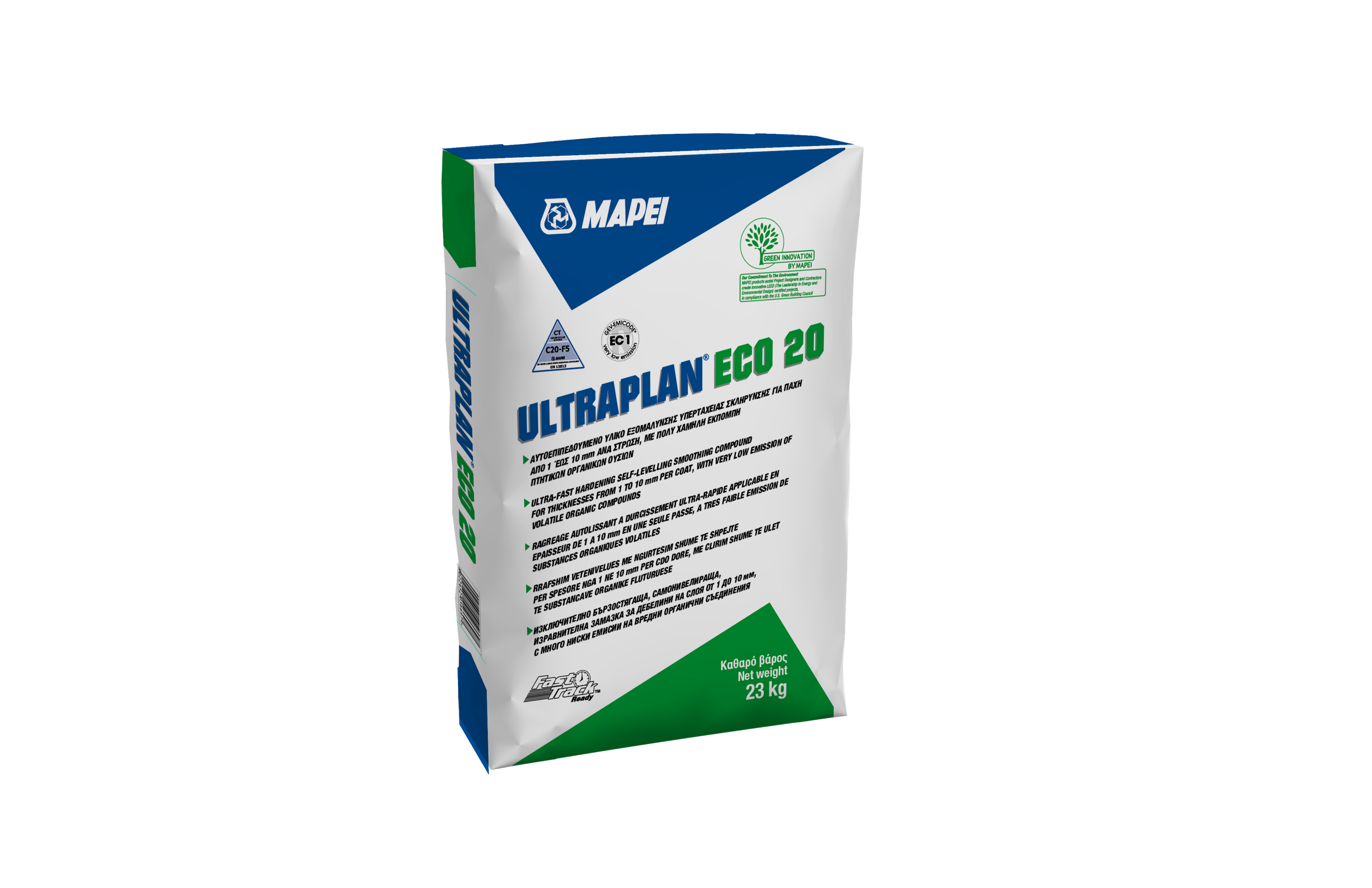 Ultraplan Eco 20 is a grey powder consisting of special cement with fast setting and hydrating properties, with selected graded silica sand, resins, and special additives prepared according to a formula developed in the MAPEI Research Laboratories.