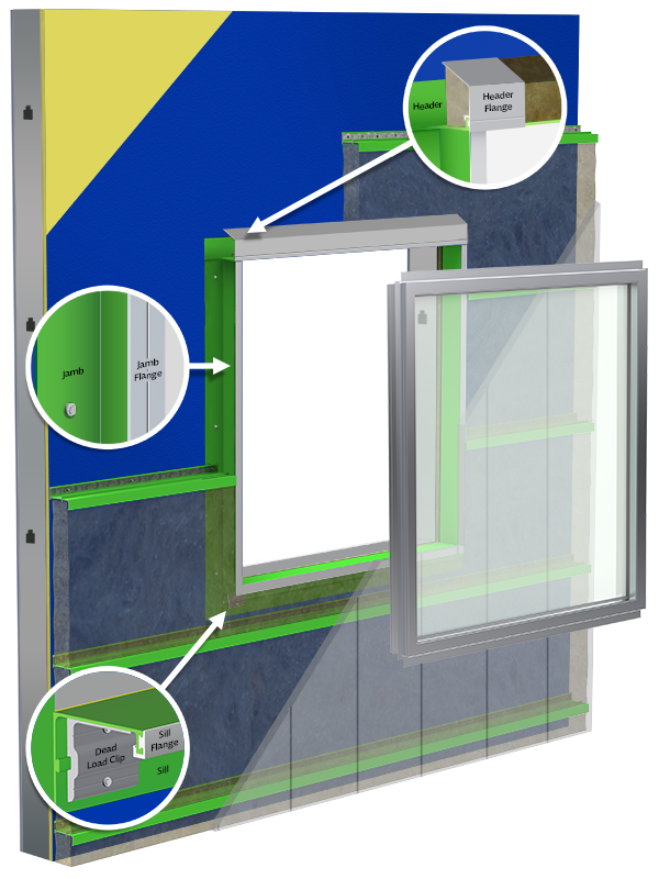 GreenGirt CMH XO is a composite metal hybrid continuous insulation system for windows that combines the structural properties of steel with the thermal benefits of fiberglass and is comprised of GreenGirt CMH XO structural header, jamb, or sill components, integrated with steel flanges.