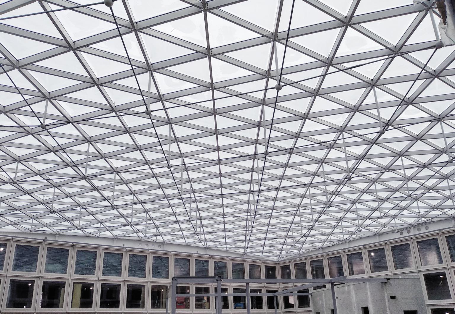 The product consists on a composition of steel profiles, the connecting nodes between the profiles (discs or spheres) and accessories (caps or covers, bolts and nuts). The applications are in the form of Single-layer system and Space grid system.
