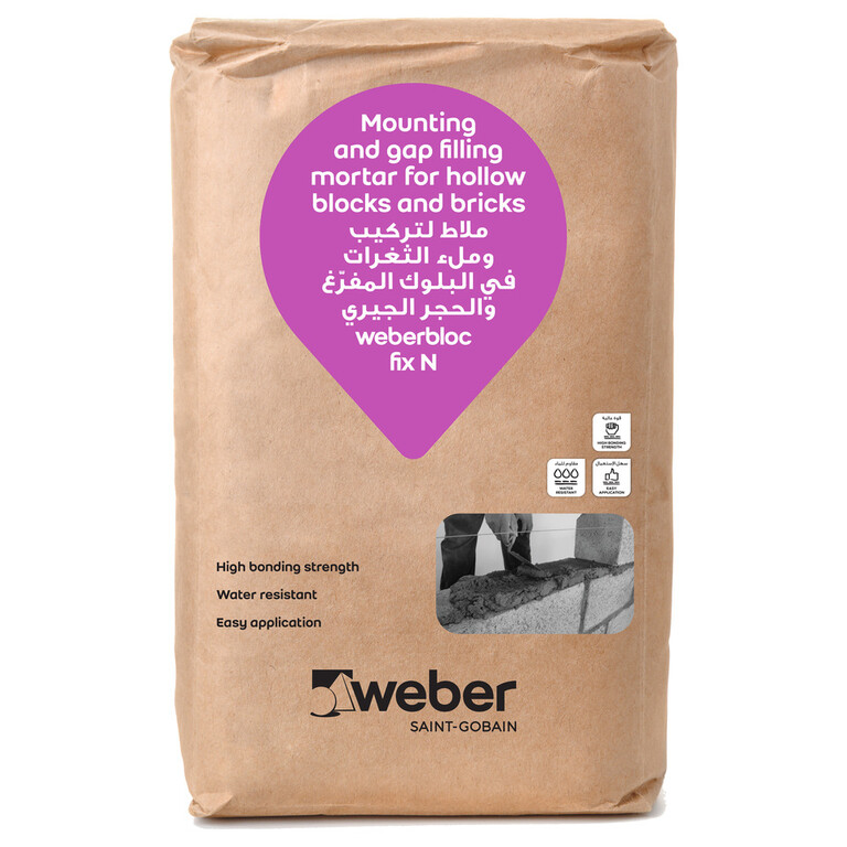 Weberbloc fix N is a ready mix mounting mortar that requires only the addition of water. It is made of cement, graded sand and additives for improved workability, better bonding and water retention.
