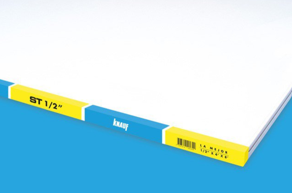 Placa de Yeso ST 1/2” is a standard plasterboard consisting of gypsum mixture with additives at its core and a paper liner on each of its sides. The visible face is white color, and the backward face is cafe.