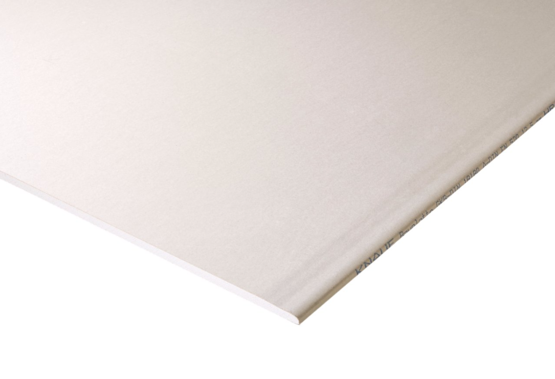 Placa de Yeso Cartón Knauf ST 10 mm is a standard plasterboard consisting of gypsum mixture with additives at its core and a paper liner on each of its sides. The visible face is Ivory color, and the backward’s face is grey.