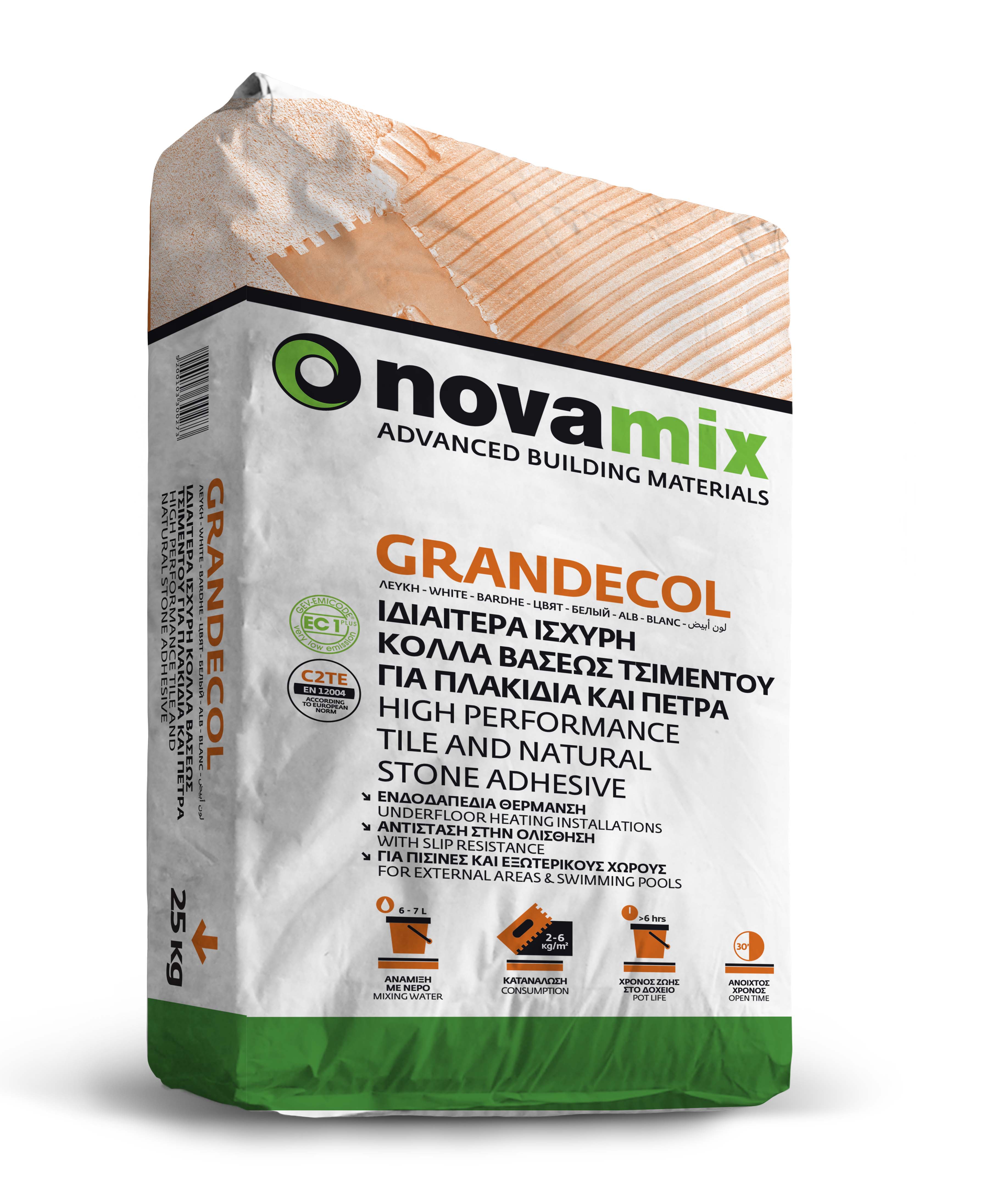 GRANDECOL is a high-quality, improved, cementitious adhesive with reduced slip and extended open time, classified as C2TE. It contains binding agents, polymer binders, aggregates, fillers, and additives, all carefully combined to ensure robust and reliable fixing.