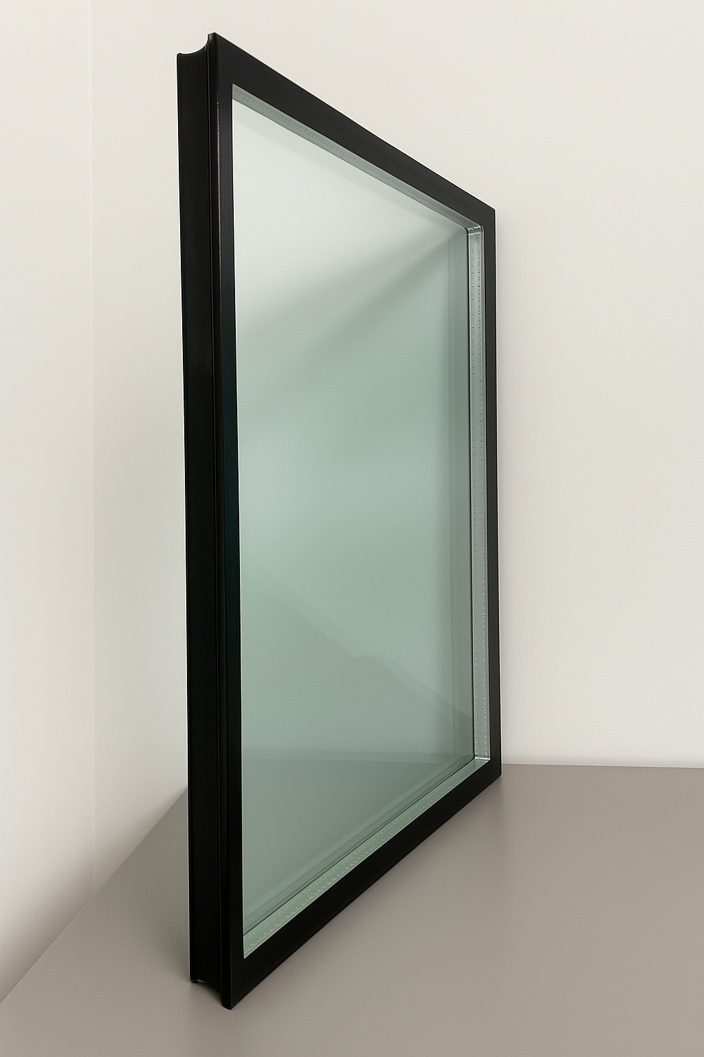 A double-glazed insulating glass unit is made up of two 4 mm thick glass panes with a spacer frame between them. The unit is hermetically sealed along its perimeter. The inner glass pane is coated, while the outer pane is uncoated float glass. The space between the panes is filled with argon gas, and the unit features primary and secondary seals along with a spacer bar. The design, dimensions, glass coating and properties of the glass unit are selected by calculation, taking into account the application and specific performance characteristics