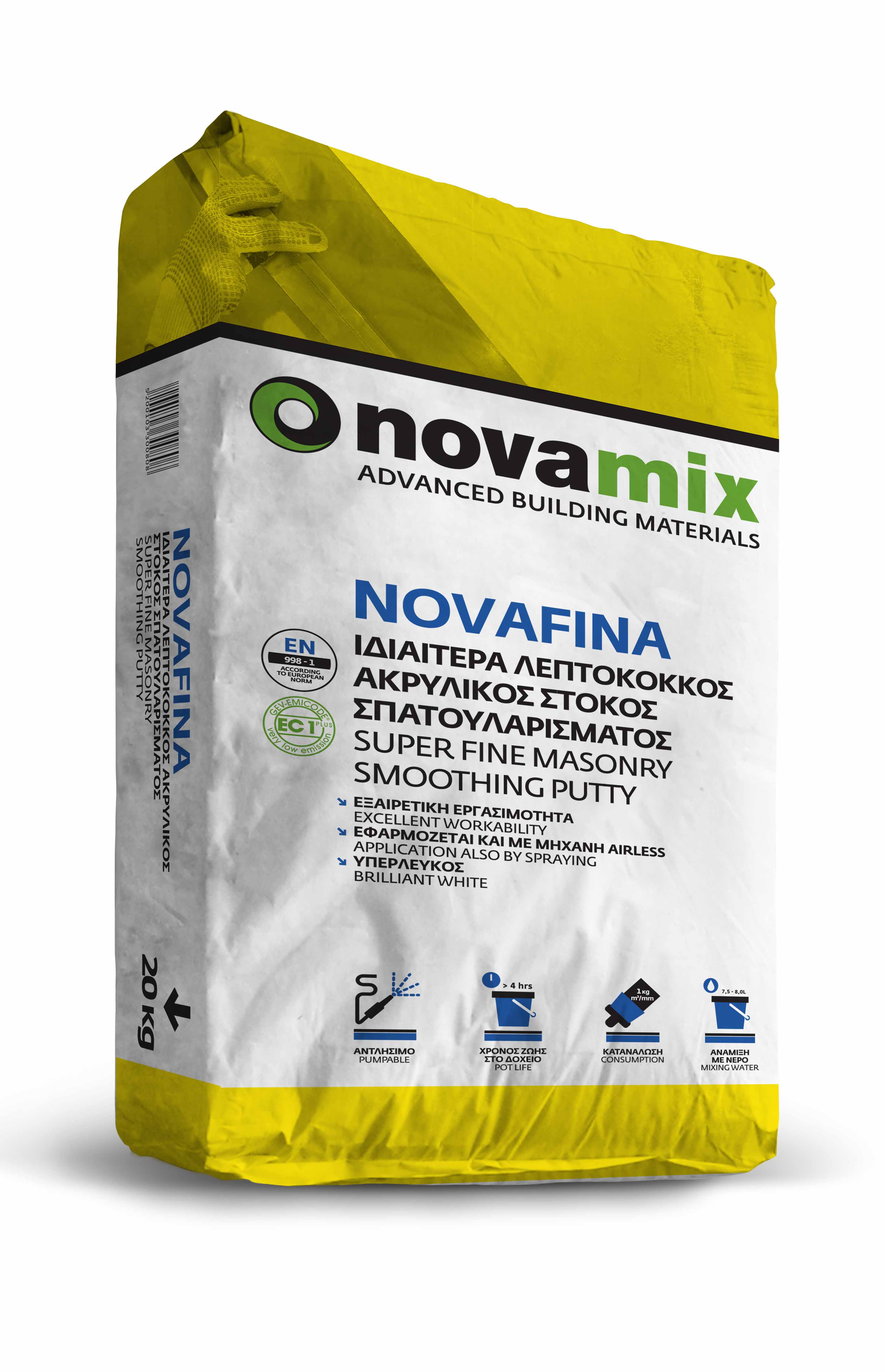 NOVAFINA is a cement-based levelling compound for walls enriched with special resins and additives. Its unique formulation includes ultra-fine particles, which contribute to remarkable workability, leading to the achievement of smooth and uniformly leveled surfaces. The high quality of the product ensures long-term resilience and durability over time. Classified as type GP CS II W0 according EN 998-1.