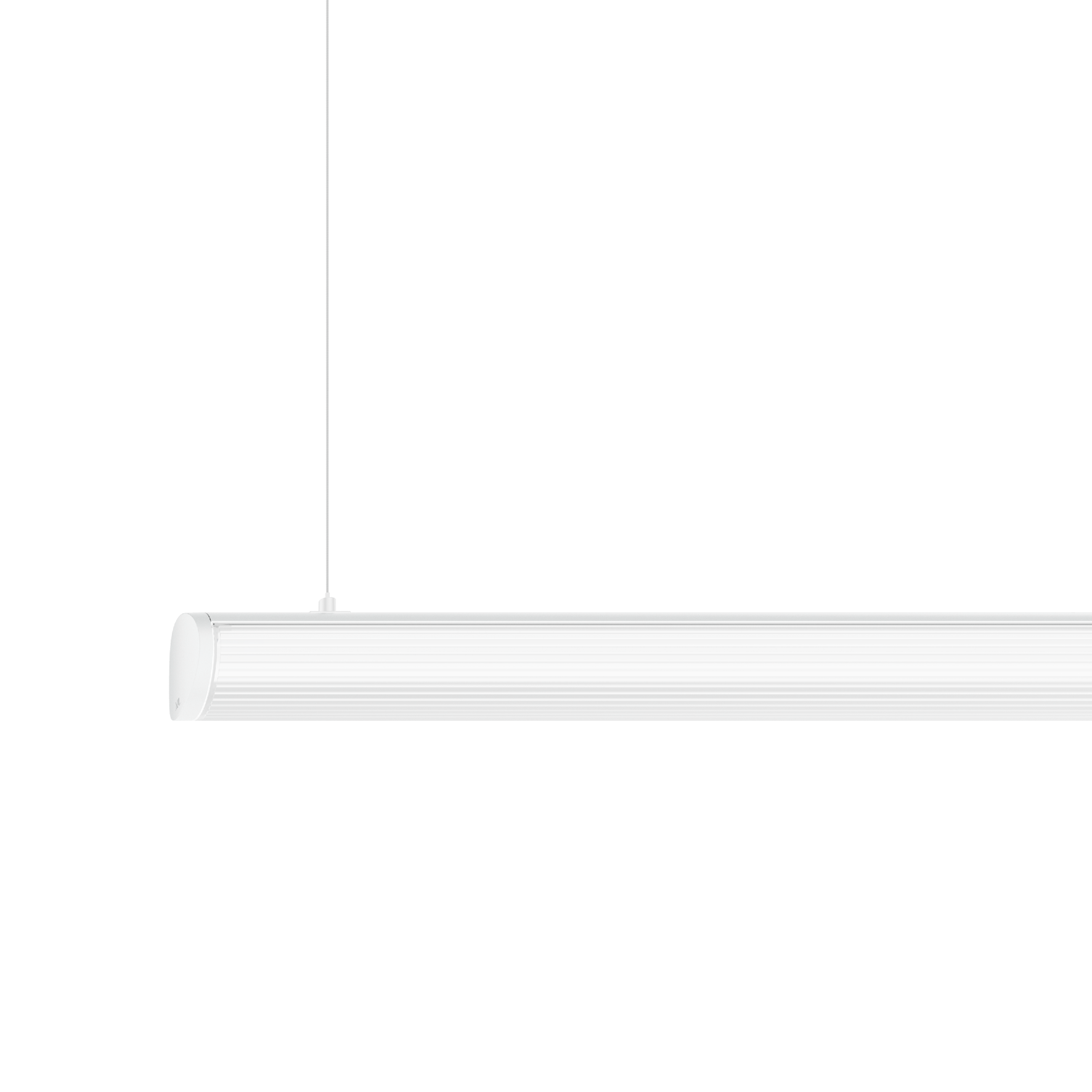 Luminaire with supporting profile in extruded aluminium and aluminium end caps; surface powder coated. Available as surface-mounted version for wall or ceiling installation, or as suspended version with cable suspension and tool-free height adjustment including feeder cable. Light control via high-quality lens system for maximum, homogeneous illumination. Choice of completely homogeneously illuminated, cylindrical HPO (High Performance Opal) cover (TUBO) or clear cylindrical cover with linear prismatic optic (TUBIN). Equipped with energy-efficient LEDs featuring very good colour rendering.