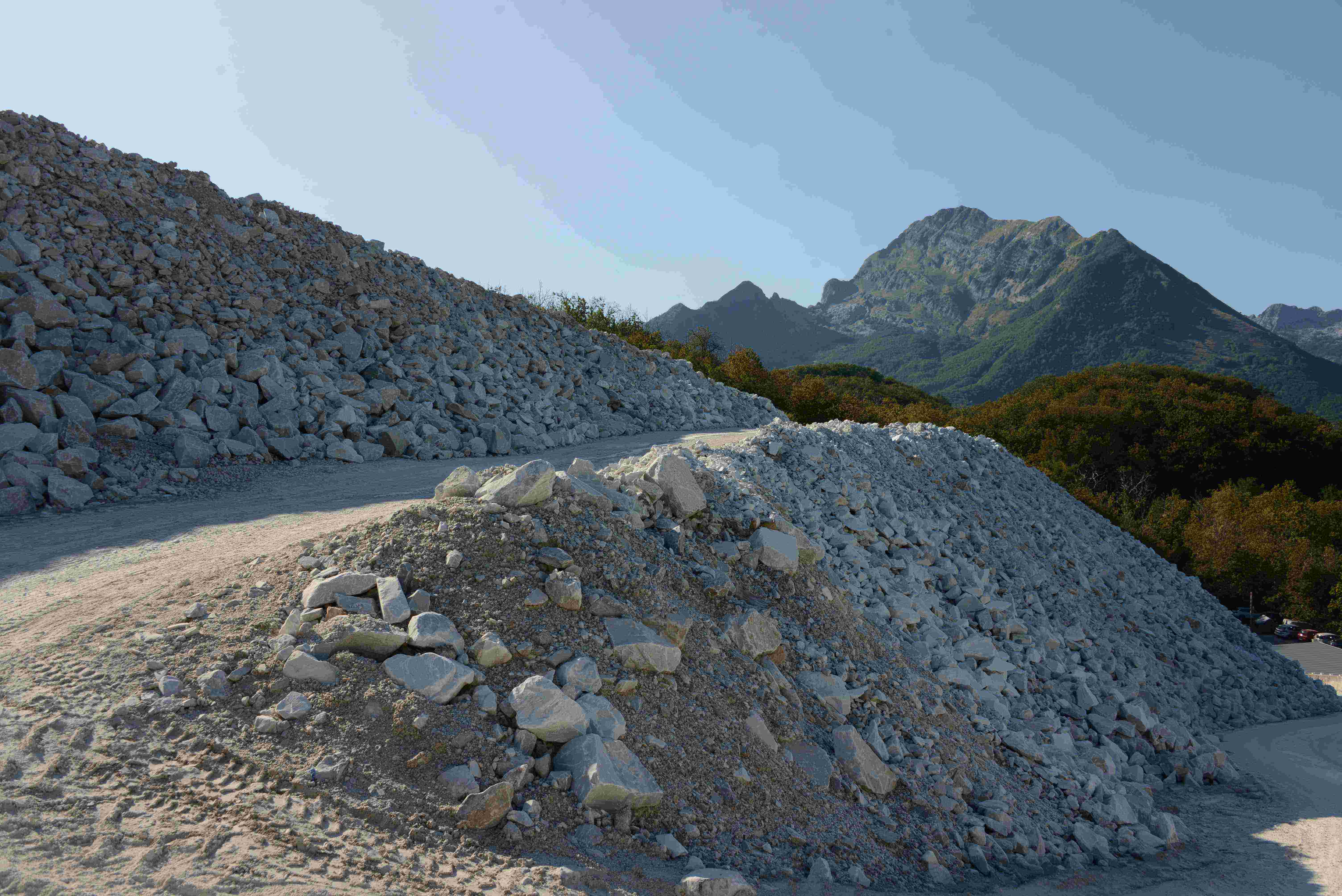 Ground Calcium Carbonate (CaCO₃) is produced by Mi.Gra. Srl through the mechanical processing (crushing, grinding, and classification) of marble quarry residues. The material is recovered entirely from abandoned or active quarry deposits (“ravaneti”), thus reducing the use of virgin rock and supporting environmental restoration of the Apuan Alps and Minucciano Municipality. The products are offered in different granulometric fractions, ranging from fine powders (<150 µm) to coarse sands and stabilized aggregates, depending on the intended industrial or construction application. The chemical composition is primarily calcium carbonate (≥93–99%), with only trace levels of silica, iron oxides, and magnesium oxide.