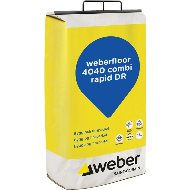 weberfloor 4040 combi rapid DR is a dust reduced, fine smoothing compound with paste consistence for fine filling and repairs of concrete, particle board, stone, ceramics, and gypsum plasterboard internally in buildings. It can be used on floors, walls and ceilings in housing, offices, and public areas indoors. It is suitable as underlayment for most surface coverings such as tiles, vinyl flooring, linoleum flooring and floating parquetry.