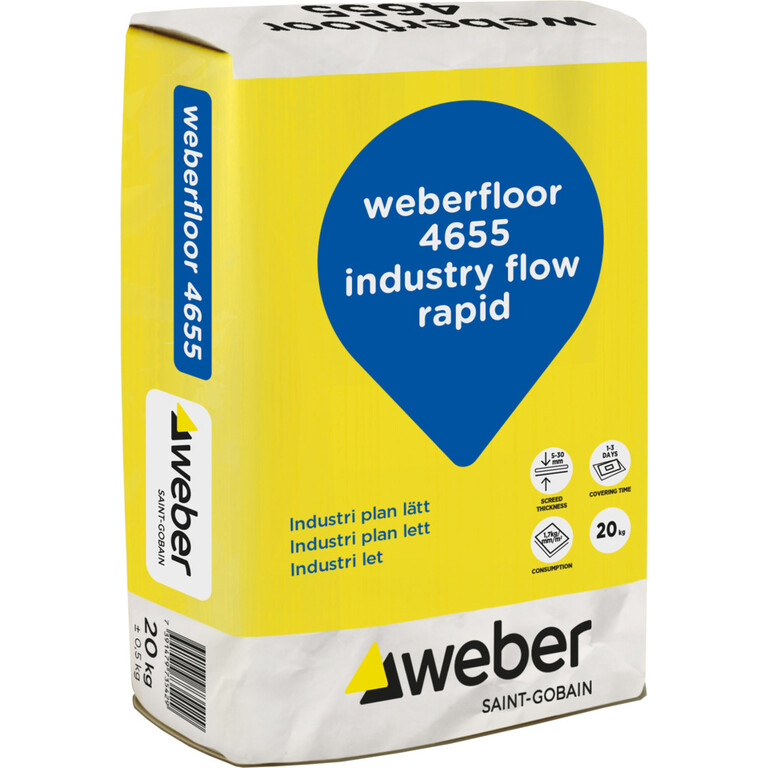 weberfloor 4655 industry flow rapid is a pumpable, fast-curing, low-alkaline, self-leveling leveling compound intended as a finished wear layer or substrate for epoxy and polyurethane coatings on industrial floors with light loads. The product is particularly suitable for short renovation times and where high demands are made on surface flatness.