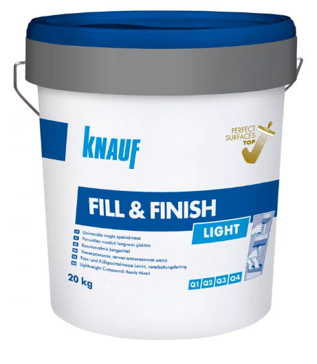 Fill & Finish Light universal joint compound is a ready-to-use, polymer-based finishing material designed for high-quality and durable wall and ceiling treatments for interior applications. Its composition includes dolomite powder, vinyl binder, and performance-enhancing additives, ensuring easy application and excellent adhesion to various surfaces such as gypsum boards, concrete, and lime plasters. The material can be applied manually or mechanically, creating layers up to 2 mm thick. Ideal for final coats before painting, it meets surface quality standards Q2-Q4.