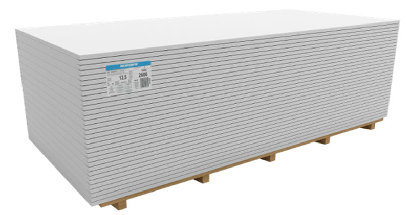 Norgips GKB is a gypsum board for use in construction inside buildings. It is used for all types of buildings and for use in dry construction systems used in rooms with a relative humidity of not more than 70%. The maximum application temperature is 50°C. The board is used as a cladding for suspended ceilings, attic cladding and wall cladding.