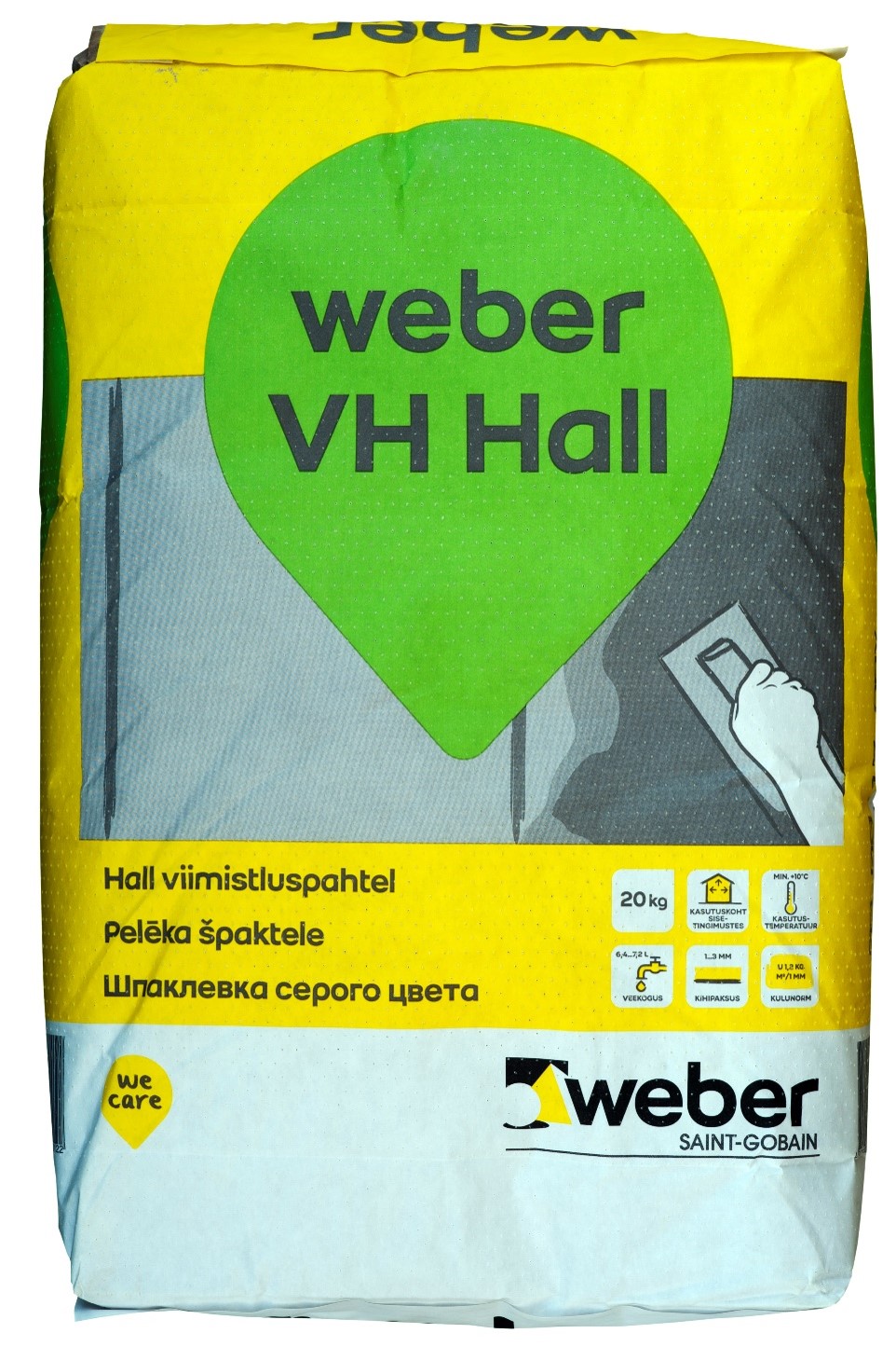 weber VH Hall is a cement-based finishing mixture for dry, damp and wet rooms, also outdoors. For finishing ceilings and walls, and as a base coat for facade paint outdoors.