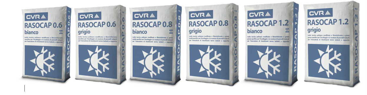 The RASOCAP family includes polymer-modified, water-repellent and fiber-reinforced cementitious skim coats, available in white and grey cement formulations and in different granulometric ranges (0.6, 0.8, 1.2 mm). These products are specifically developed for civil finishing applications, combining bonding and skimming functions in external thermal insulation composite systems (ETICS).