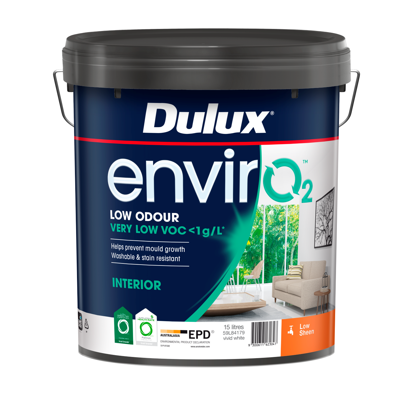Dulux EnvirO2 Interior Low Sheen White is a very low VOC, low odour premium water based paint. It produces a washable, stain resistance and hard wearing finish suitable for all interior living areas. It contains mould protection to help prevent mould growth.