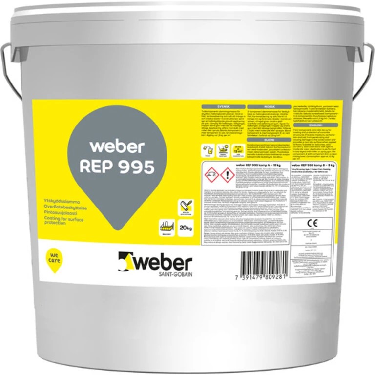 weber REP 995 ytslamma is a two-component semi-elastic cement/copolymer-based coating. The product comes with a powder section and a liquid section in the same package. weber REP 995 ytslamma is waterproof but diffusion open and has very high resistance to CO2 penetration. Some colour variations may occur. If you want a smoother surface, Weber Strong concrete paint is recommended. weber REP 995 ytslamma is nonylphenol free.