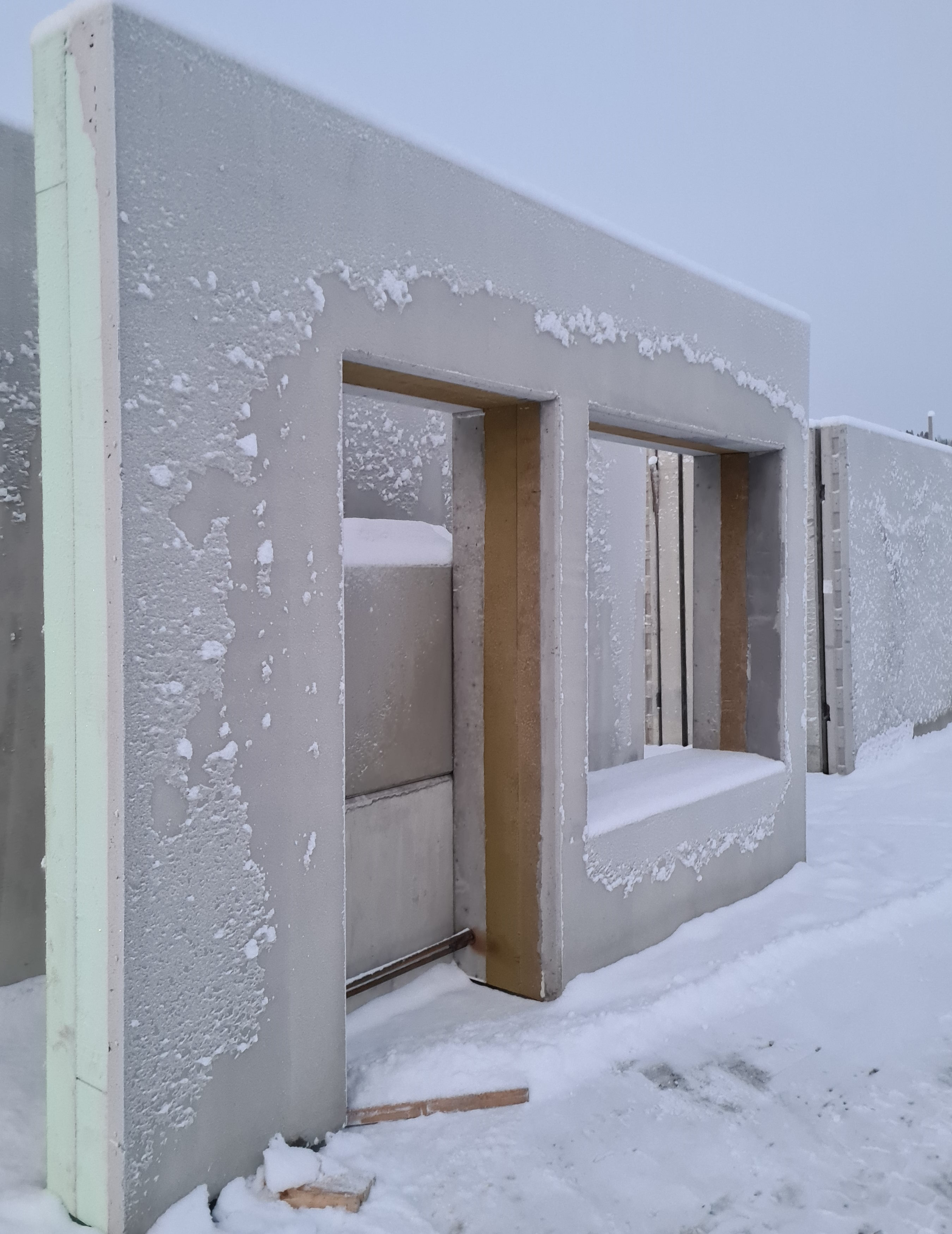 Prefabricated concrete sandwich wall with concrete strength class C35/45 and exposure class XD3/XF4, insulated with expanded polystyrene insulation. Used for building houses or other structures.