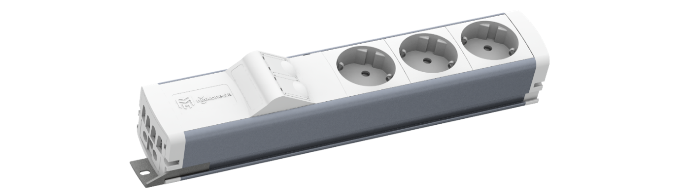 Designed for office furniture and workstation integration, provides modular flexibility for electrical and data connections. It includes components such as aluminium profiles, plates for UTP cables, blind plates, and covers for cable and connector installation. The product supports electrical and data connectivity in structured workspace environments.