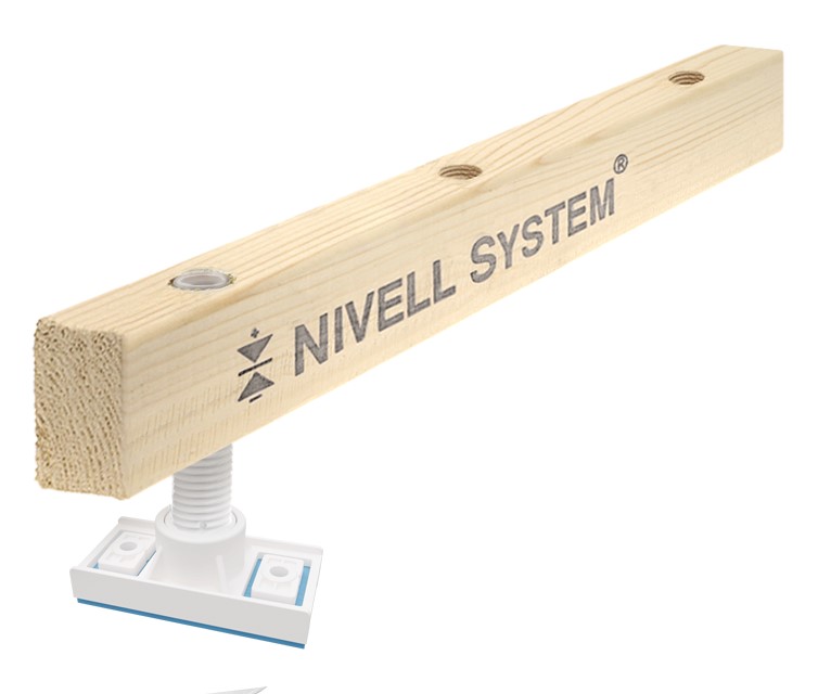 The Nivell system consists of a wooden joist, an adjustment screw, and an effective sound-dampening pad.