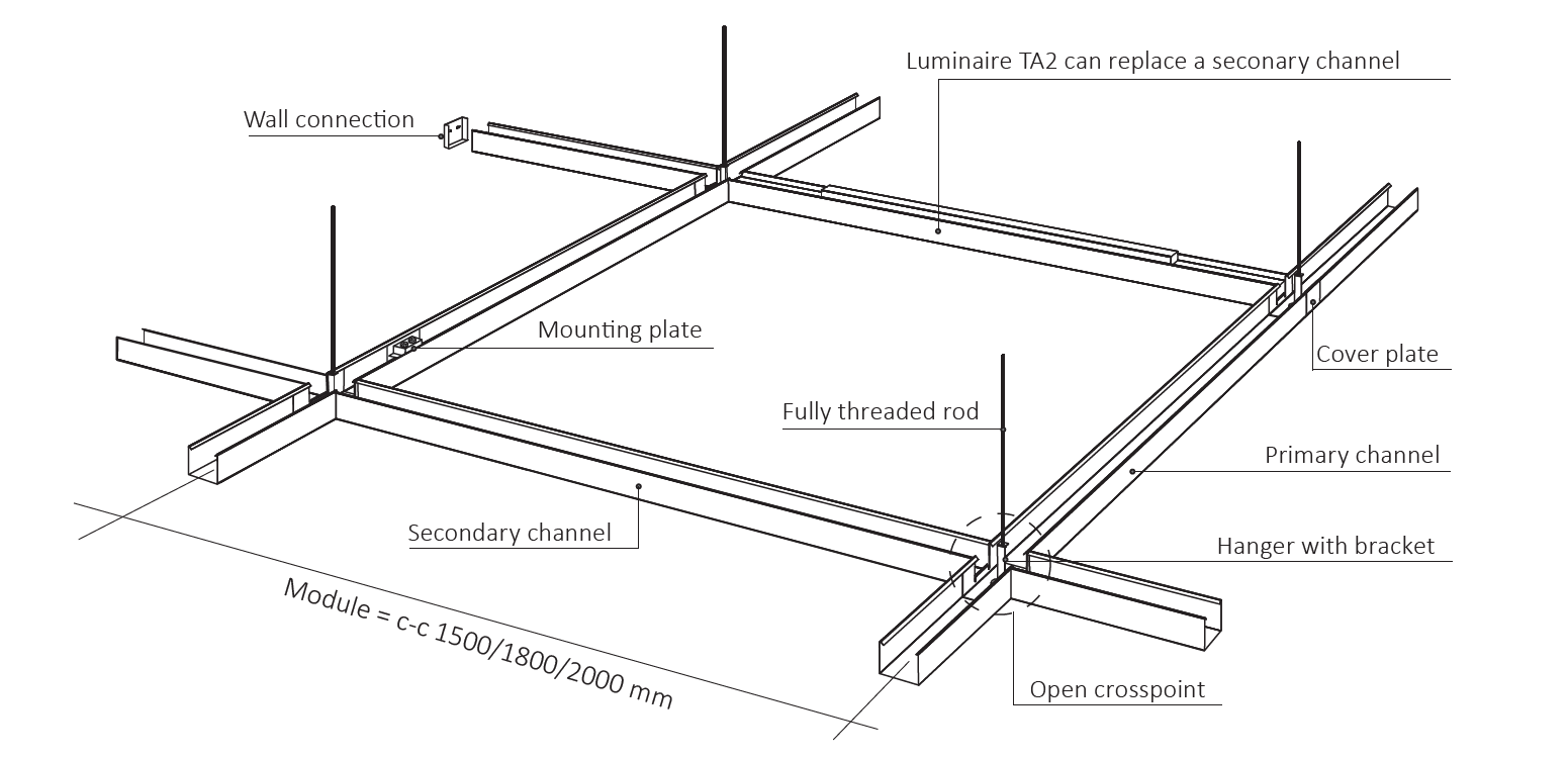 Modular suspended ceiling systems for indoor applications, consisting of load-bearing grid structures, ceiling panels and suspension components fixed to the building structure.