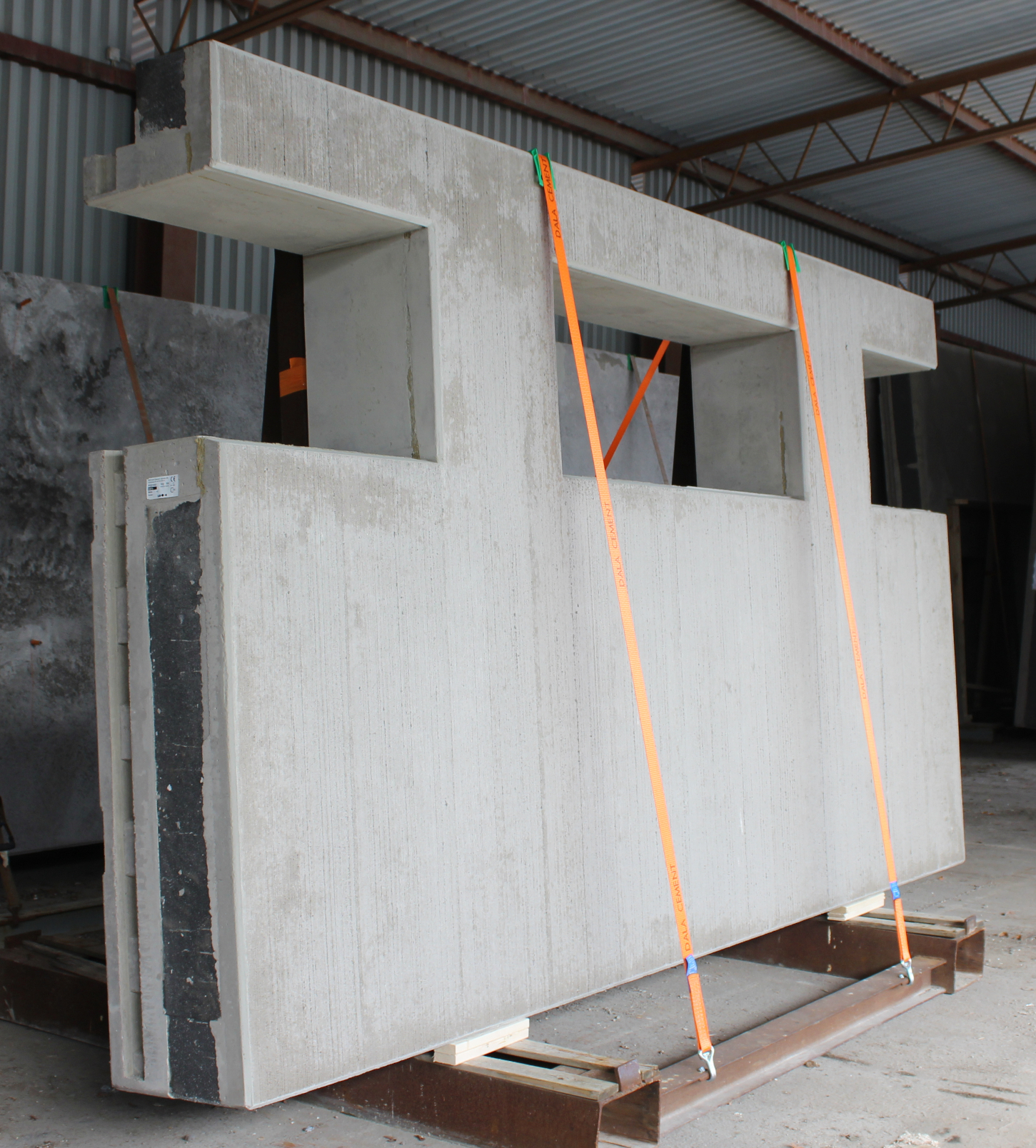 A three-layer exterior wall with insulation enclosed by two concrete forms to either side.