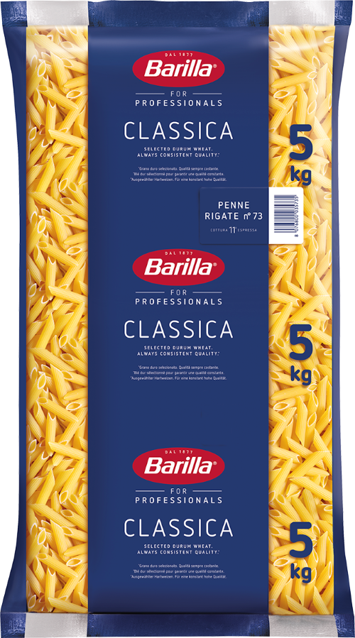 English descriptionDurum wheat dried semolina pasta for FoodService is the pasta product developed by Barilla for the Food Service. Products sold in Italy are produced in the Italian plants of Marcianise, Pedrignano and Muggia. Pasta is packed in 5 kg format and it is produced by extrusion or lamination and then a drying process. For more information about the product, visit https://www.barillaforprofessionals.com/global/products/pasta/classic/.