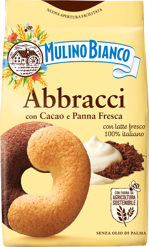 Abbracci are Italian biscuits with milk cream and cocoa powder, produced in the Barilla bakery plant of Novara. They are packed in 350, 700, 1000 grams formats and are ready for consumption. For more information about the product see http://www.mulinobianco.it/colazione-e-merenda/biscotti/abbracci. Gli Abbracci sono biscotti di pasta frolla arricchiti con panna e cacao e sono realizzati nello stabilimento italiano di prodotti da forno di Novara. Vengono confezionati in formati da 350, 700 e 1000 grammi e sono pronti per il consumo. Per maggiori informazioni relative al prodotto visitare il sito http://www.mulinobianco.it/colazione-e-merenda/biscotti/abbracci.