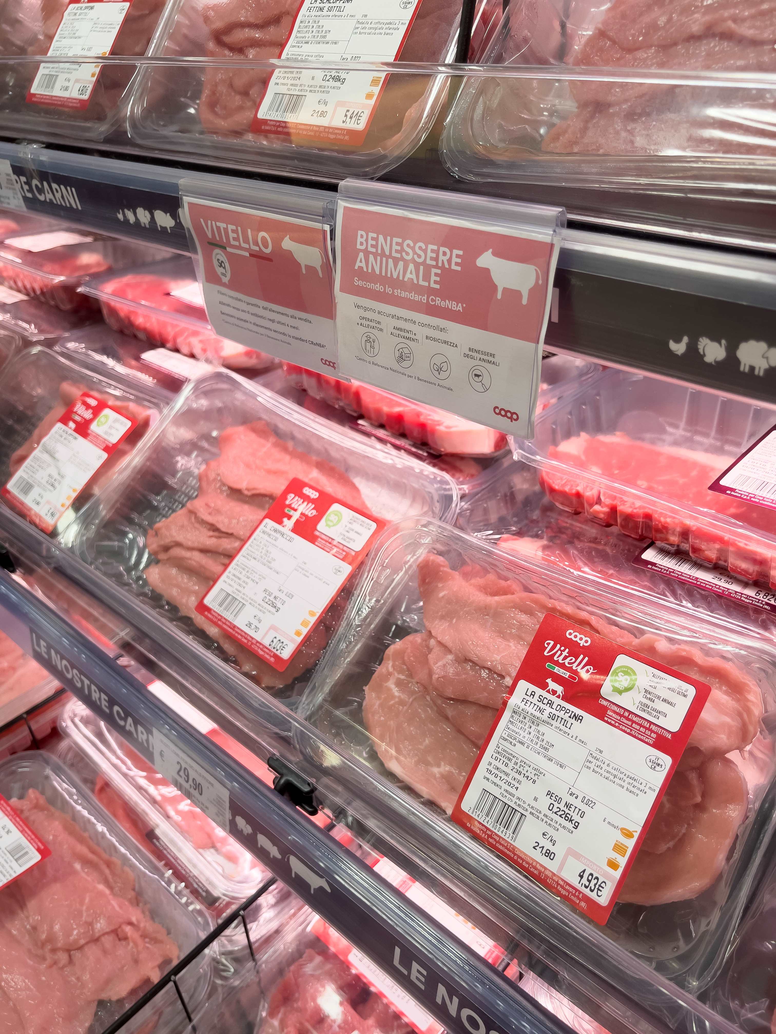 The product object of this declaration is 1 kilogram of fresh edible bone-free meat from veal calves grown in Italy and sold by Coop at its stores, in plastic packs or served at the store butcher's counter.