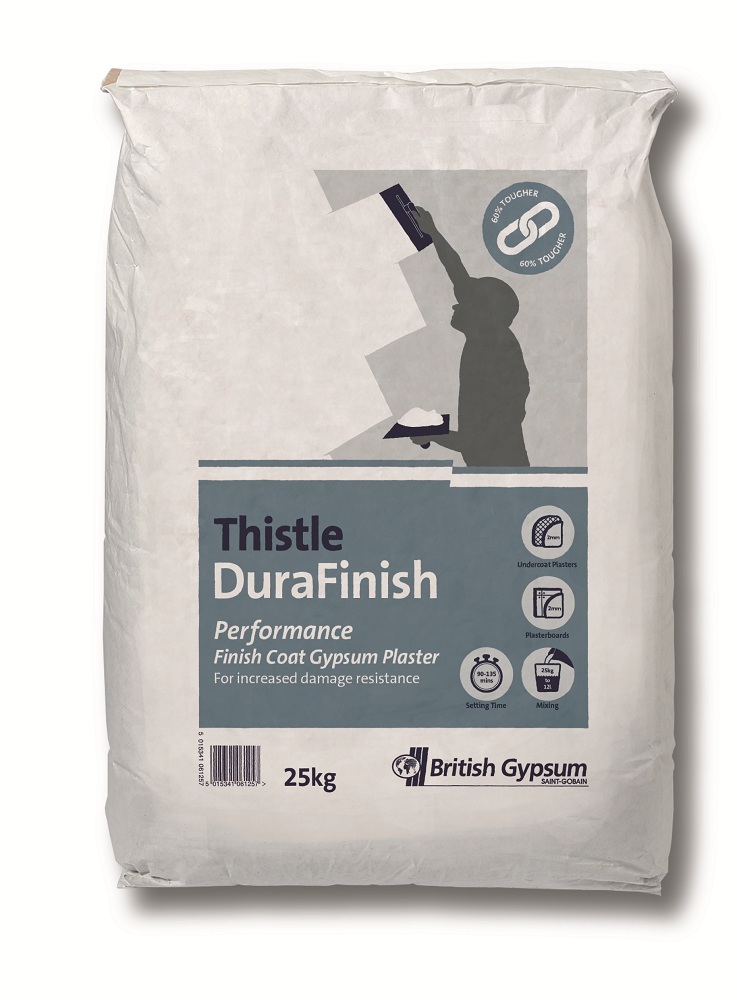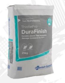 Thistle DuraFinish is a gypsum finish plaster specially formulated for increased resistance to accidental damage. It enables significantly longer maintenance intervals and lower long-term cost in heavy traffic areas of many types of buildings. It may be used on a wide range of backgrounds, including most undercoat plasters, and to enhance the surface damage resistance of any British Gypsum partition or wall lining system. It is particularly suited for GypWall EXTREME and GypWall ROBUST. Thistle DuraFinish is a gypsum finish plaster for use on a wide range of backgrounds. It provides a smooth, inert, high quality surface to internal walls and ceilings, and a durable base for the application of decorative finishes. Thistle DuraFinish is retarded hemihydrate, pre-mixed gypsum plaster, requiring only the addition of clean water to prepare it for use. This finish plaster is one of our products within our plasters range that is certified to BES 6001, achieving a rating of ‘Excellent’.