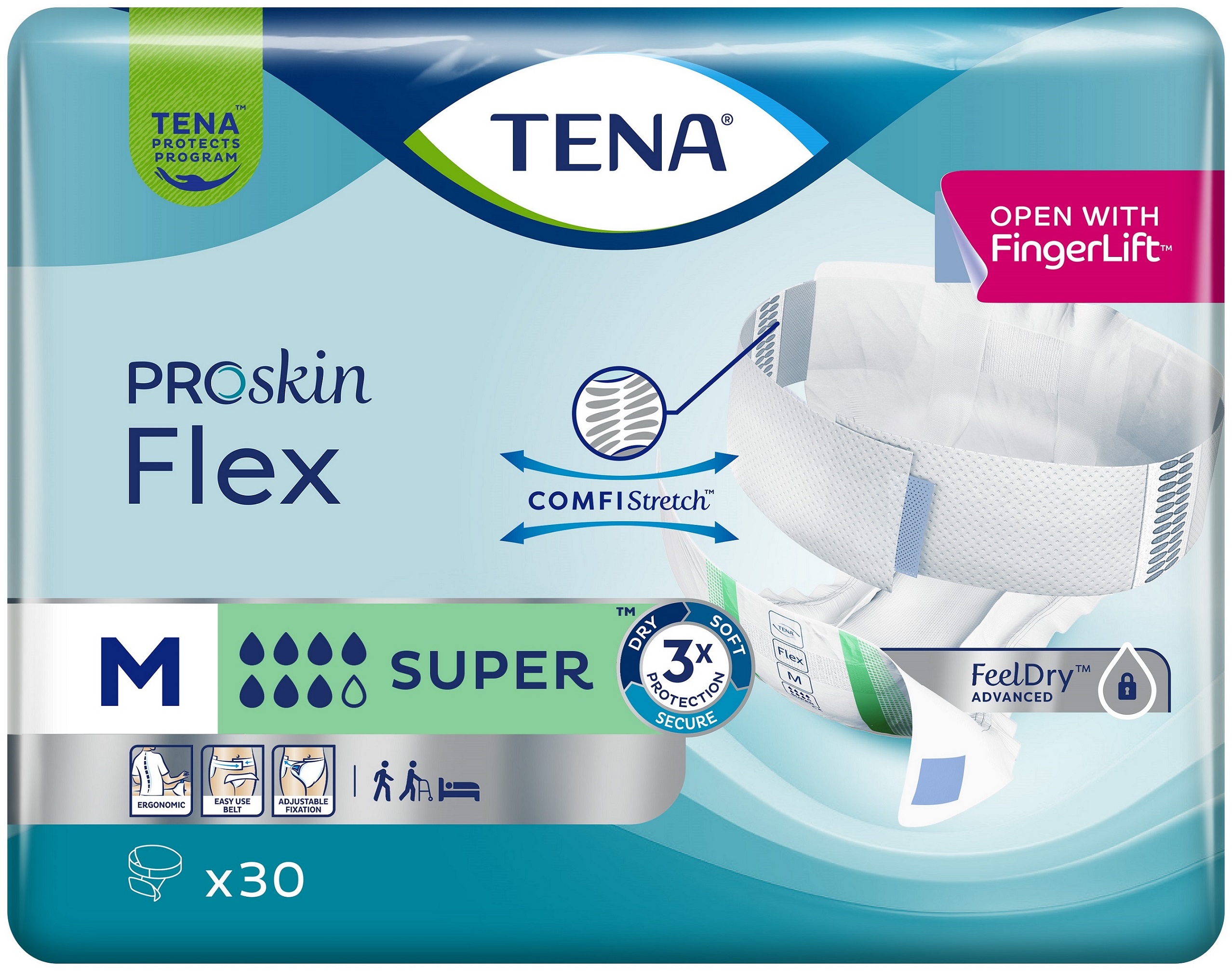 A belted product with elastic belt for easy & ergonomic changes for the carer and high security for the user. TENA Flex provides ease of use and best fit; adjusts to different body shapes, securing comfortable fit, skin health and superior leakage security. The products are available in a range of sizes and absorbency levels and are suitable for all types of incontinence. Dermatologically tested and/or Dermatologically Approved by Skin Health Alliance.
