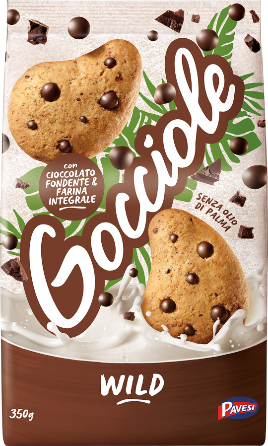 Gocciole Wild are Italian biscuits with chocolate chips and whole wheat flour, produced in the Barilla Italian bakery plant of Novara. They are packed in 350 grams format and are ready for the consumption. For more information about the product see https://www.gocciole.it.