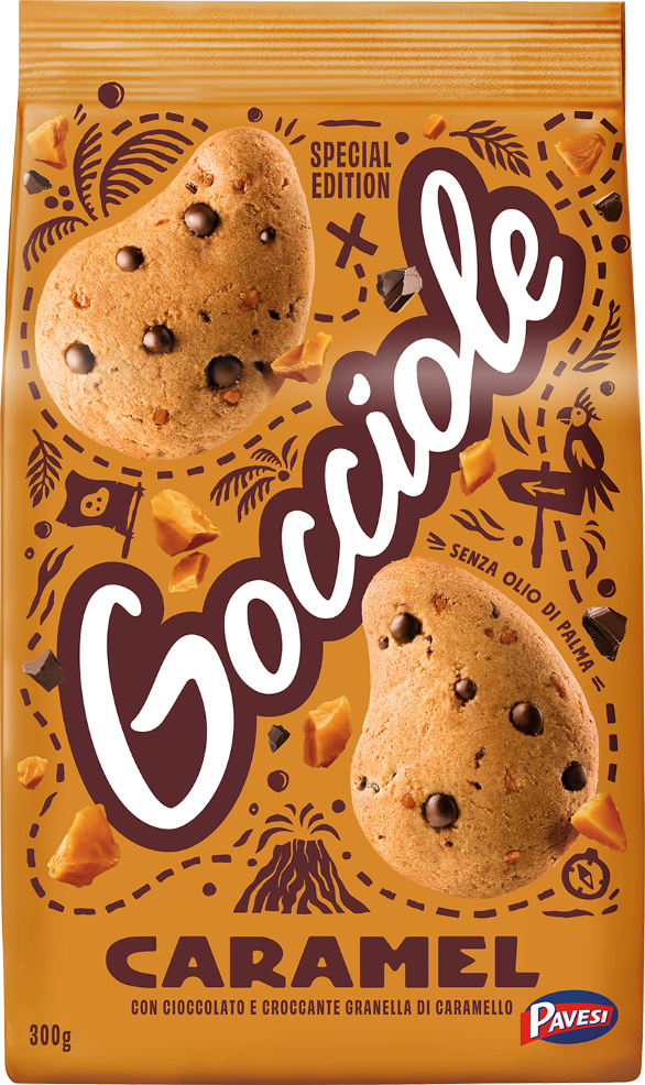 Gocciole Caramel are Italian biscuits with chocolate chips and caramel, produced in the Barilla Italian bakery plant of Novara. They are packed in 300 grams format and are ready for the consumption. For more information about the product see https://www.gocciole.it.